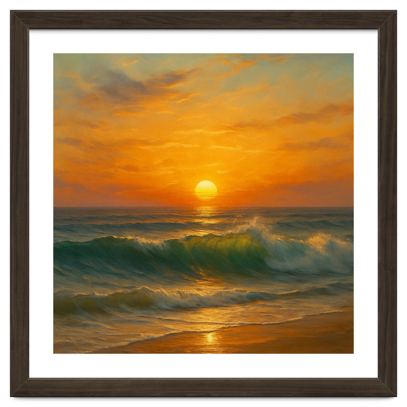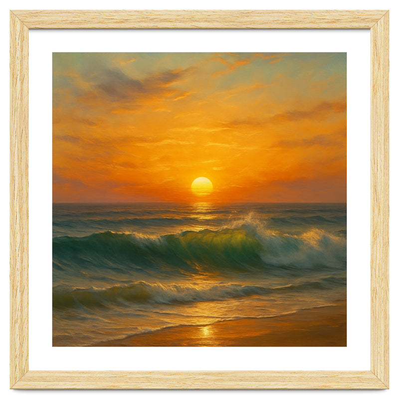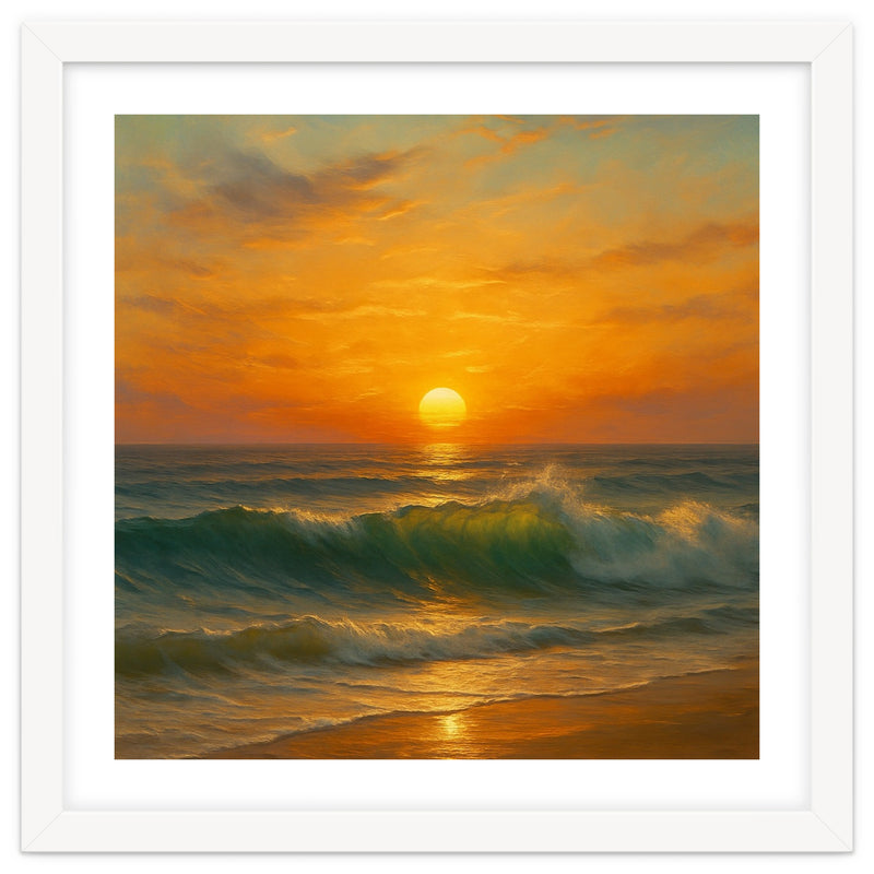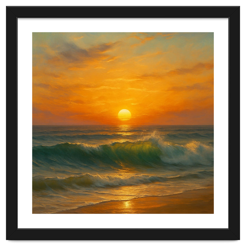 "Eternal Horizon" is painted in the style of Romantic Realism, using oil on canvas to capture both the depth of color and the softness of the sunset glow. I created this seascape after spending many evenings by the shore, watching the sun sink into the horizon. On one unforgettable evening, the sky burned with fiery orange and the ocean glowed like molten gold. The waves carried both strength and serenity, and in that moment I felt an eternal harmony that words could not describe. With oil paints I preserved that fleeting beauty on canvas, so it would never be lost.