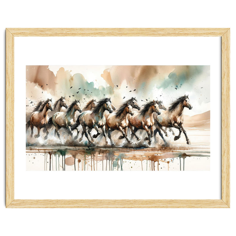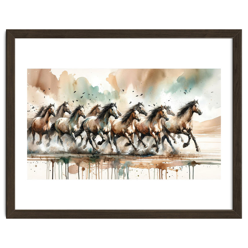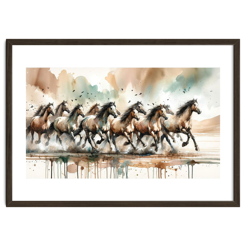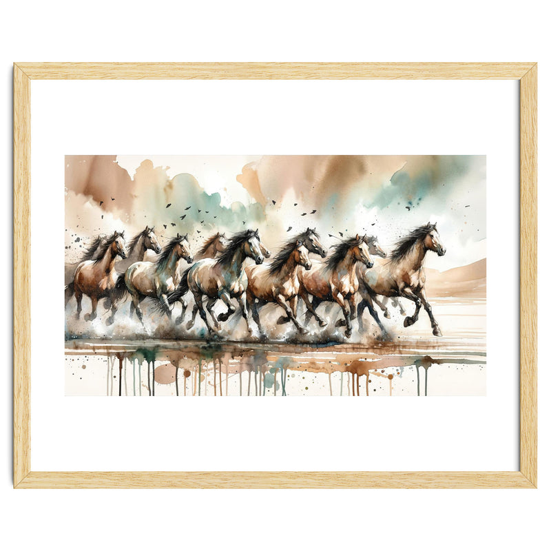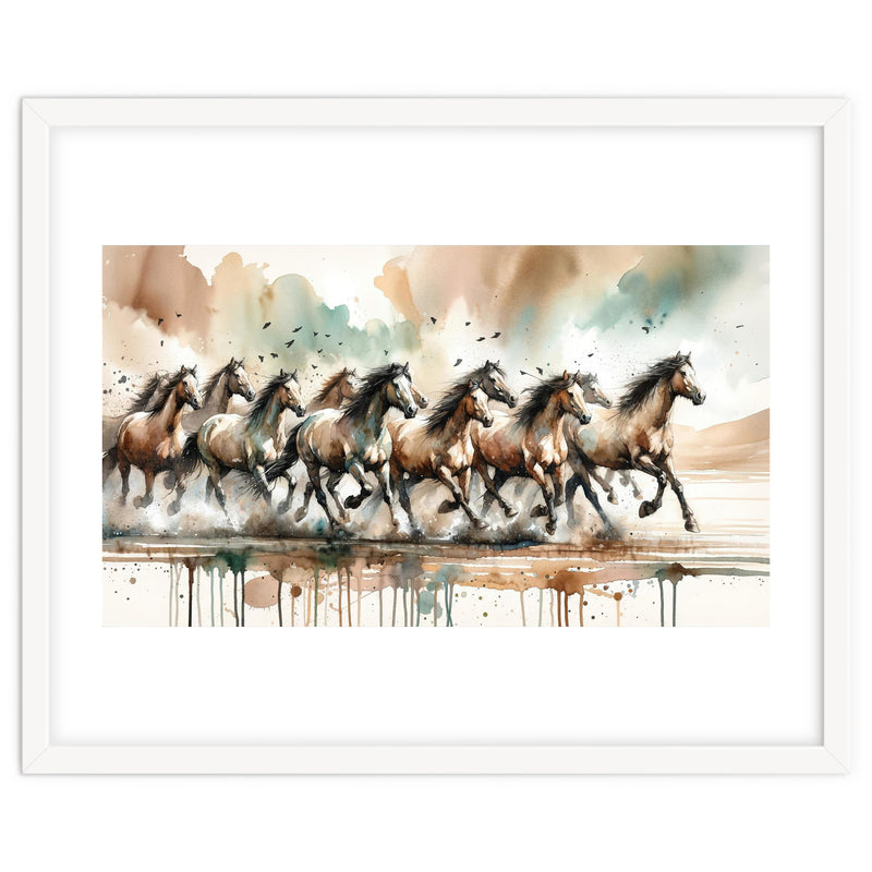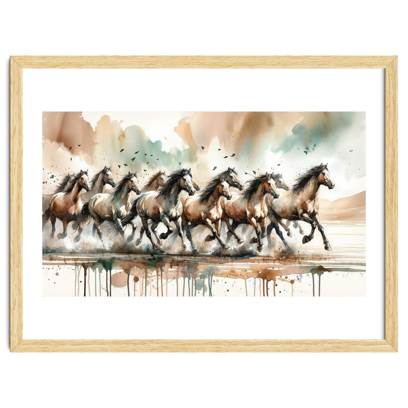 A wide herd of horses galloping across an open landscape with flowing manes, lifted hooves, dust specks, and birds in the sky.