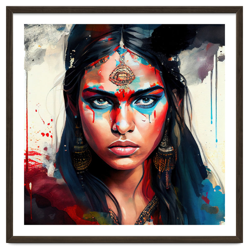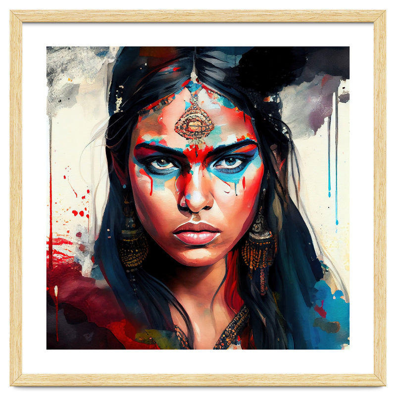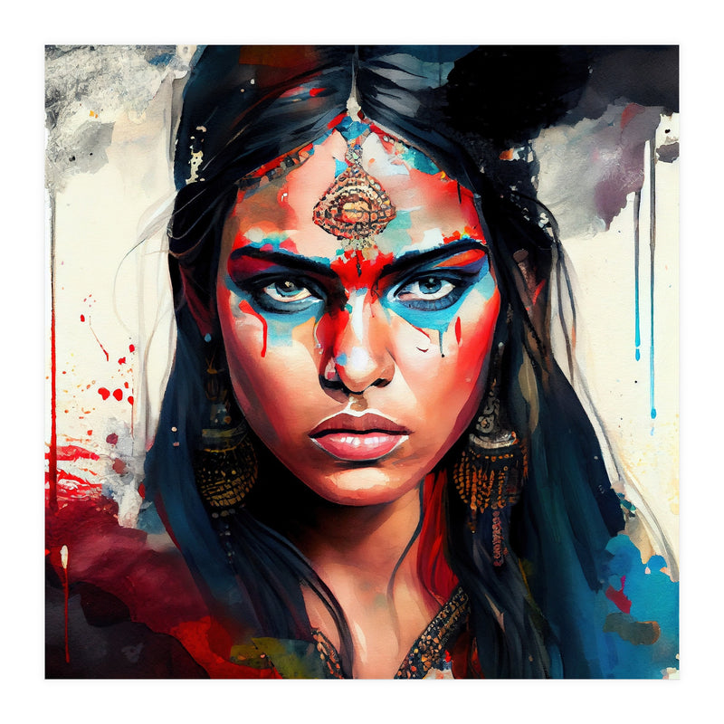 Frontal portrait with a centered bindi and ceremonial headpiece. Reds and turquoise flow across the face while a bright background keeps contours crisp and the gaze powerful for strong wall impact.