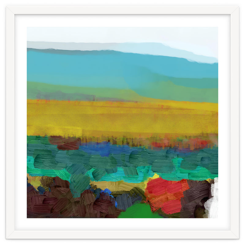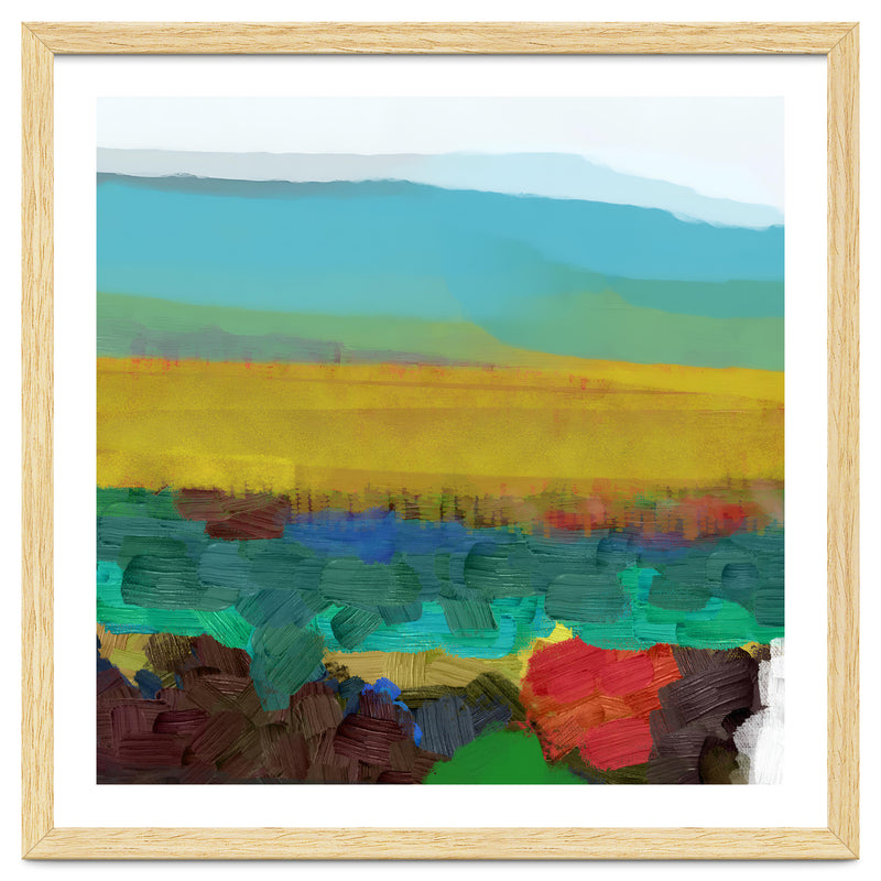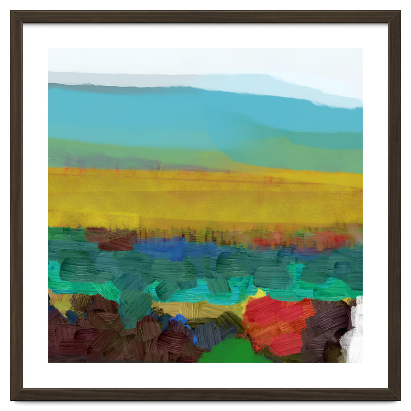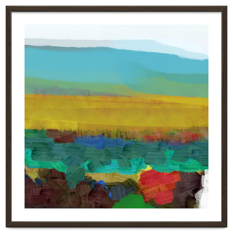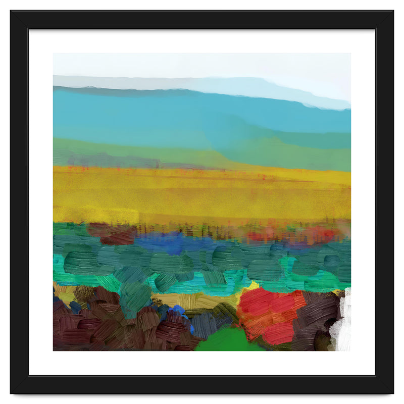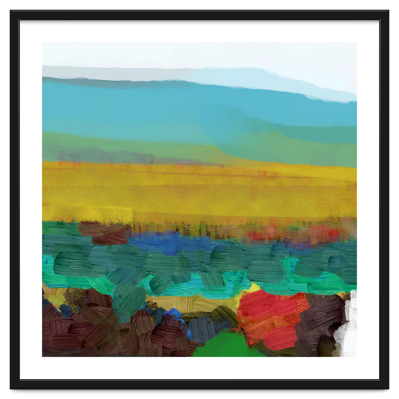 This piece uses broad, thick brushstrokes to create a highly textured, expressive landscape. The intense jewel tones of the foreground (deep red, blue, green) create a powerful visual contrast with the wide, atmospheric yellow field and the soft, cool sky above.