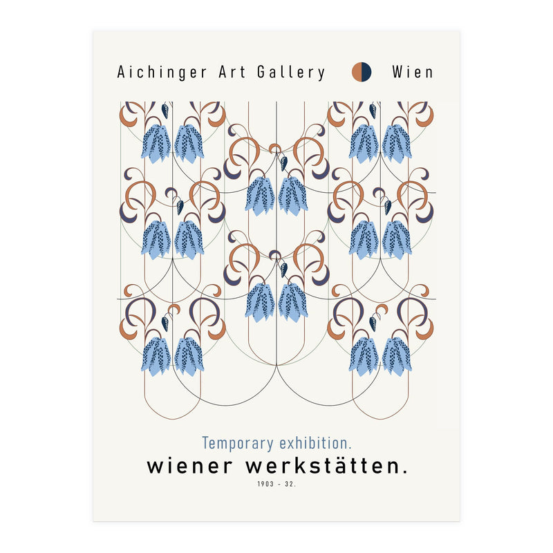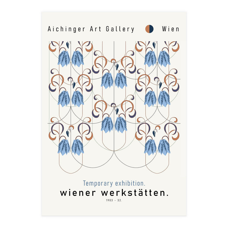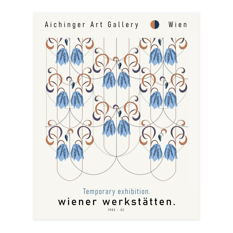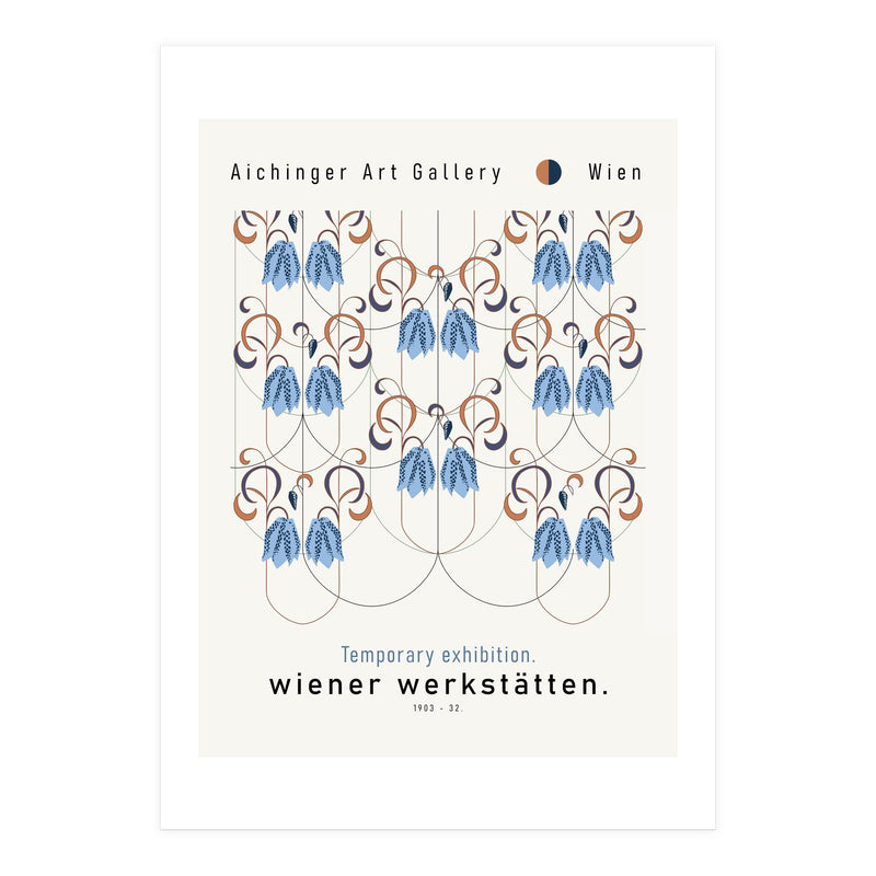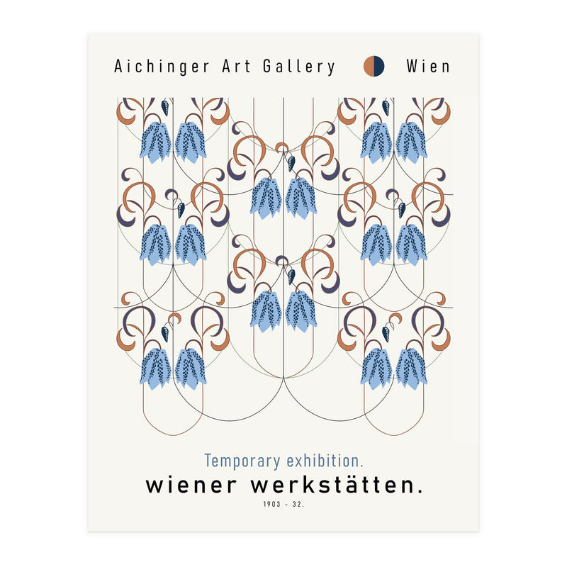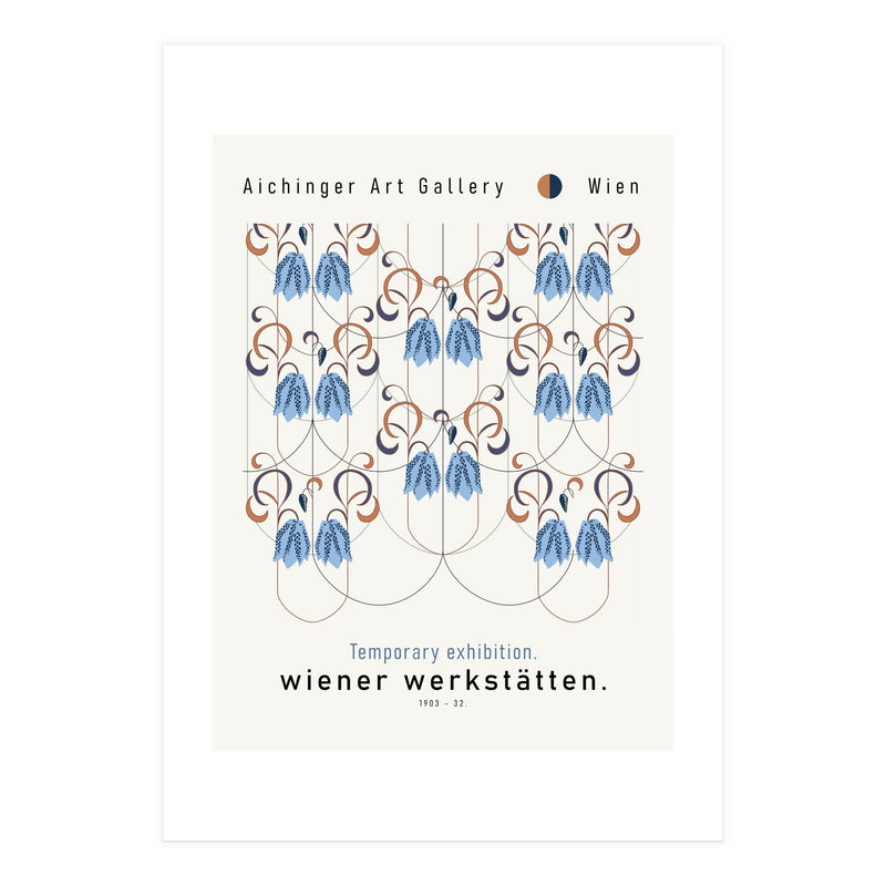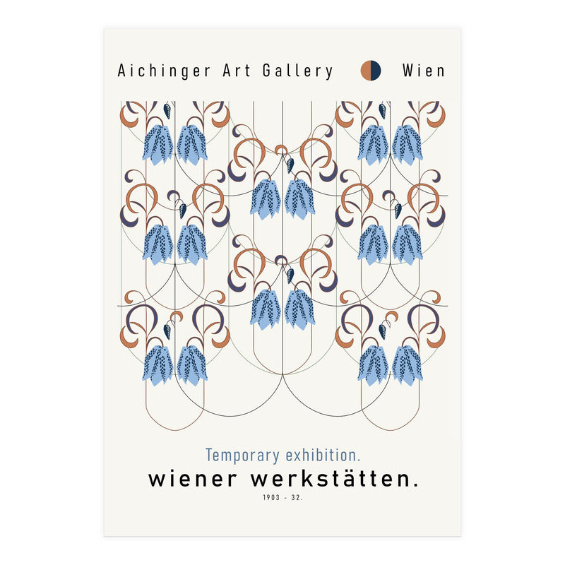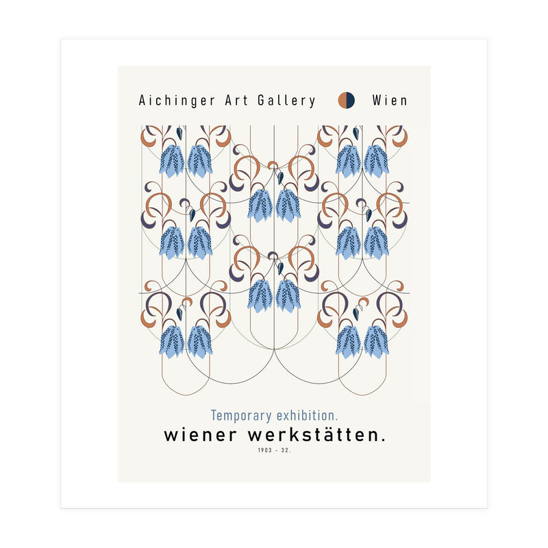 This artwork presents a refined ornamental composition inspired by the tradition of Viennese workshops. Symmetrical floral motifs unfold with measured elegance, combining delicate blue blossoms with flowing, calligraphic lines in warm, muted tones. The precise repetition of forms creates a sense of harmony and craftsmanship, while the organic curves soften the structured layout. Balancing decorative richness with restraint, the piece reflects a dialogue between historical design principles and contemporary graphic clarity. It evokes quiet sophistication and timeless beauty, celebrating the artistry of pattern, balance, and thoughtful composition.