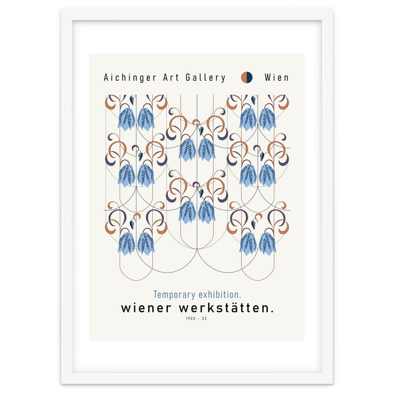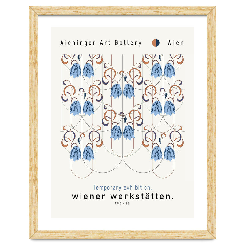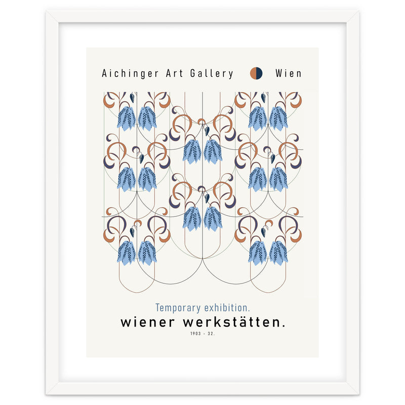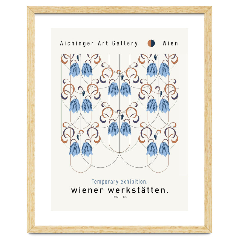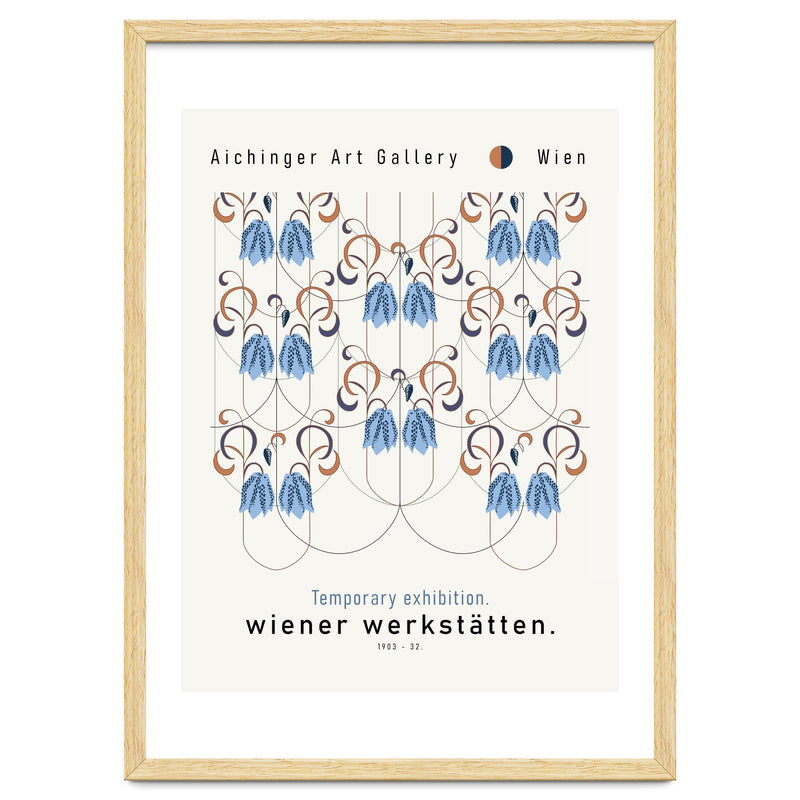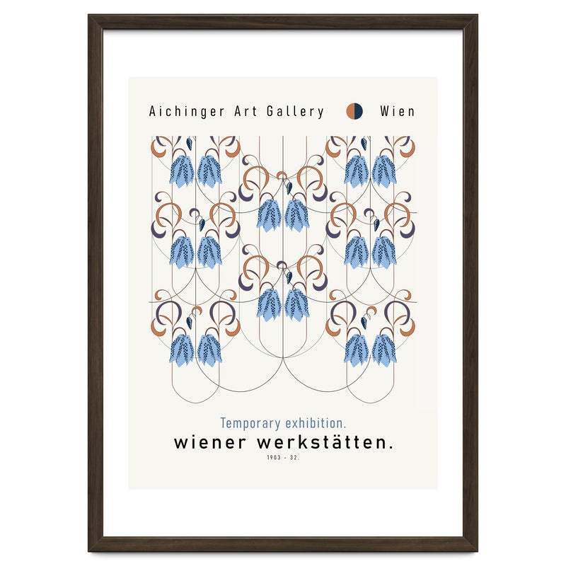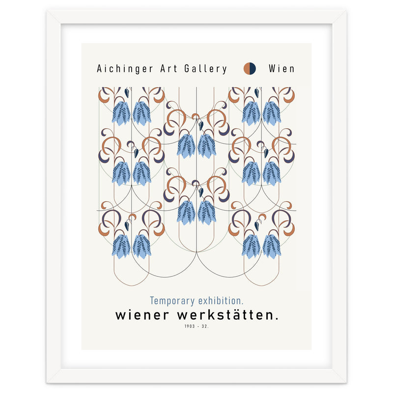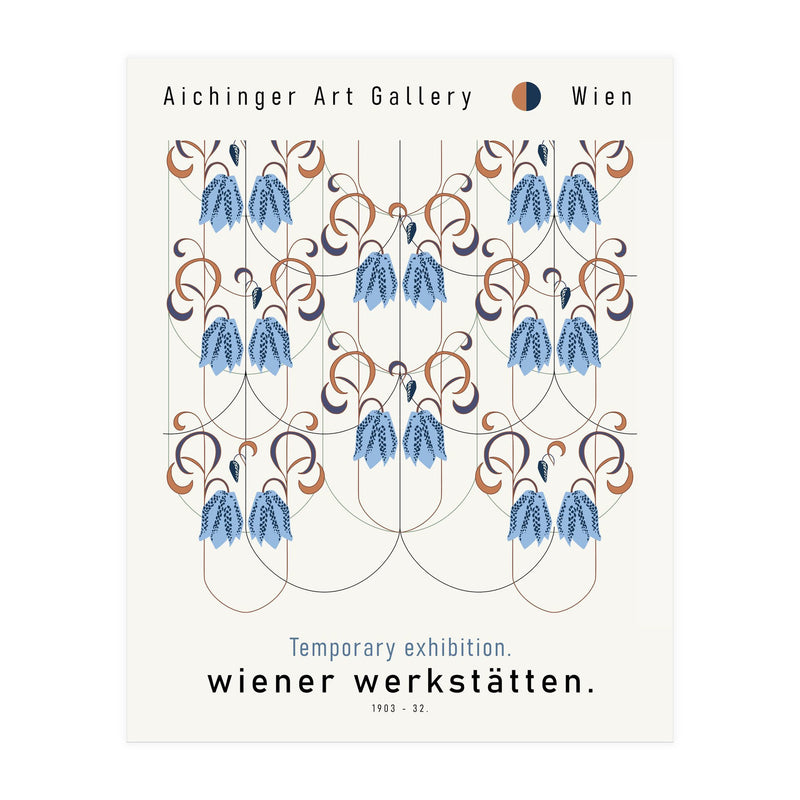 This artwork presents a refined ornamental composition inspired by the tradition of Viennese workshops. Symmetrical floral motifs unfold with measured elegance, combining delicate blue blossoms with flowing, calligraphic lines in warm, muted tones. The precise repetition of forms creates a sense of harmony and craftsmanship, while the organic curves soften the structured layout. Balancing decorative richness with restraint, the piece reflects a dialogue between historical design principles and contemporary graphic clarity. It evokes quiet sophistication and timeless beauty, celebrating the artistry of pattern, balance, and thoughtful composition.