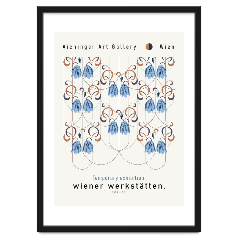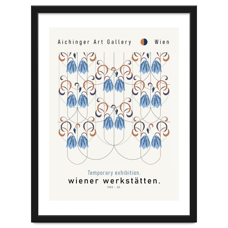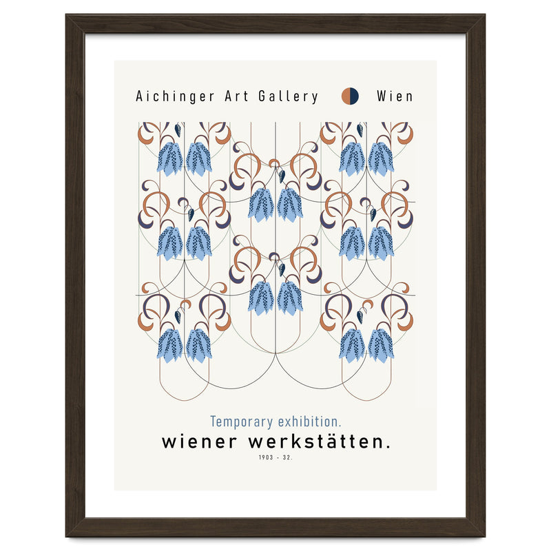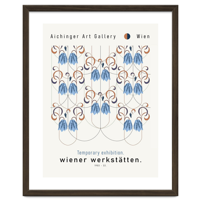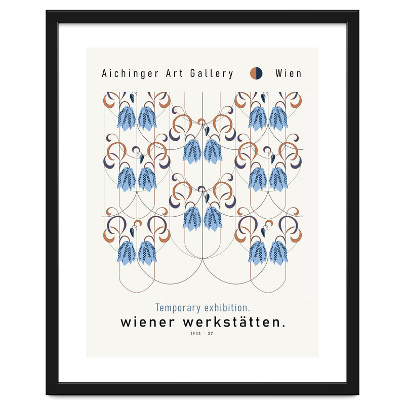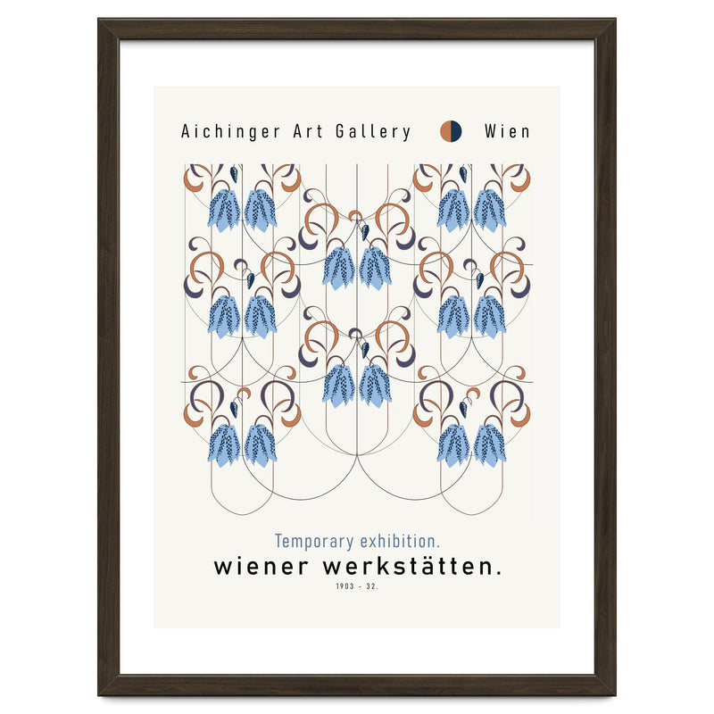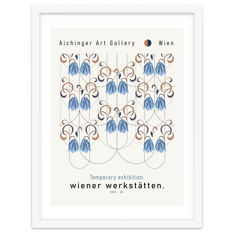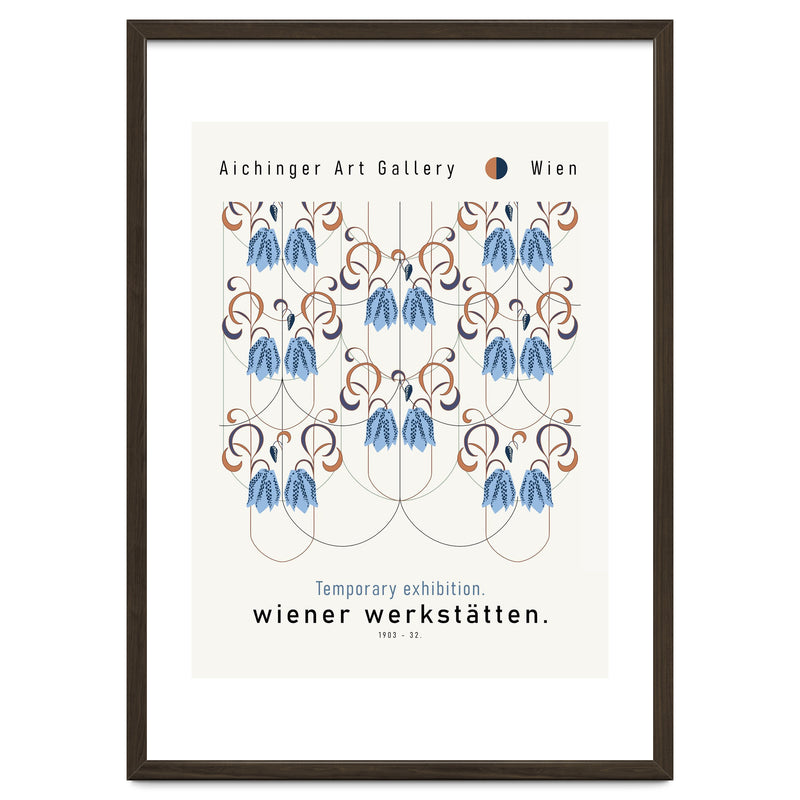 This artwork presents a refined ornamental composition inspired by the tradition of Viennese workshops. Symmetrical floral motifs unfold with measured elegance, combining delicate blue blossoms with flowing, calligraphic lines in warm, muted tones. The precise repetition of forms creates a sense of harmony and craftsmanship, while the organic curves soften the structured layout. Balancing decorative richness with restraint, the piece reflects a dialogue between historical design principles and contemporary graphic clarity. It evokes quiet sophistication and timeless beauty, celebrating the artistry of pattern, balance, and thoughtful composition.