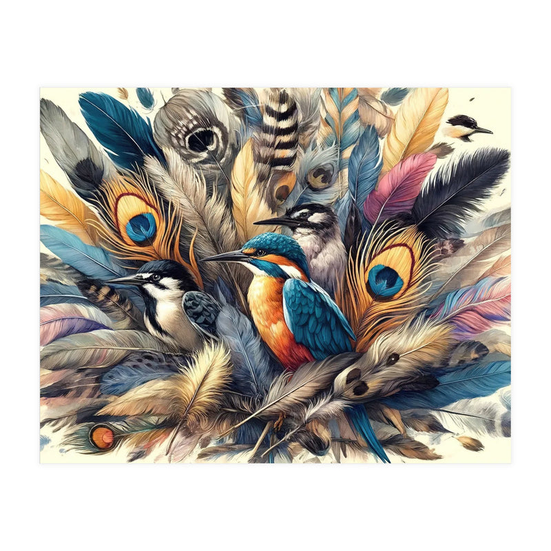 A vibrant kingfisher and delicate songbirds set among layered peacock feathers, with teal highlights, subtle eye patterns, and a clean airy background. A refined wildlife statement for contemporary interiors.