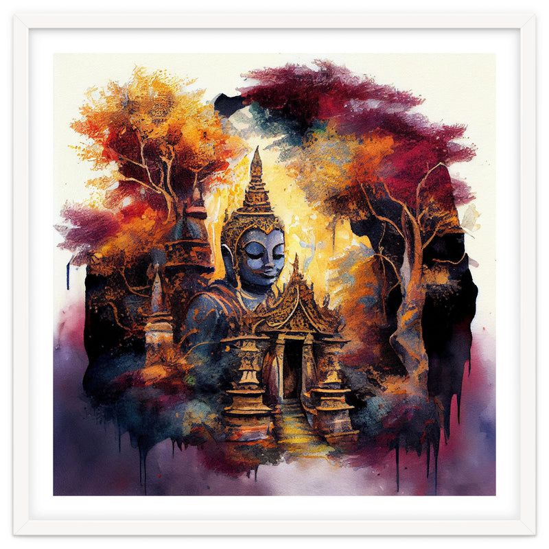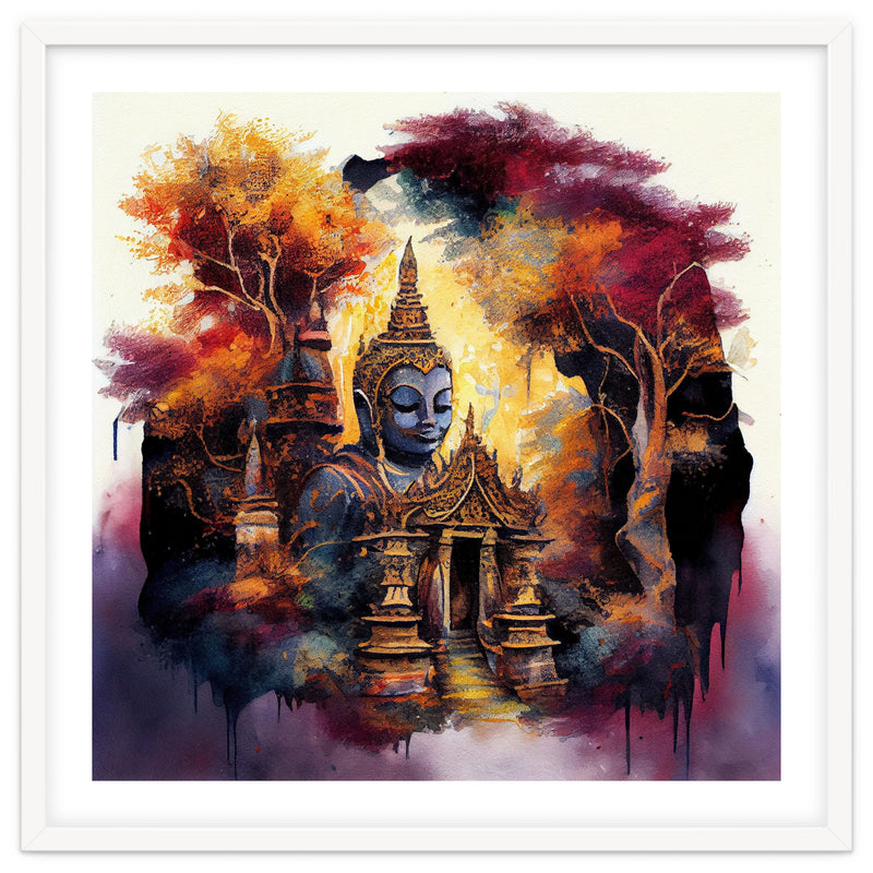 Buddha statue and temple gate surrounded by glowing autumn trees, soft mist and warm color washes, creating a calm sacred landscape focal point for contemporary interiors.