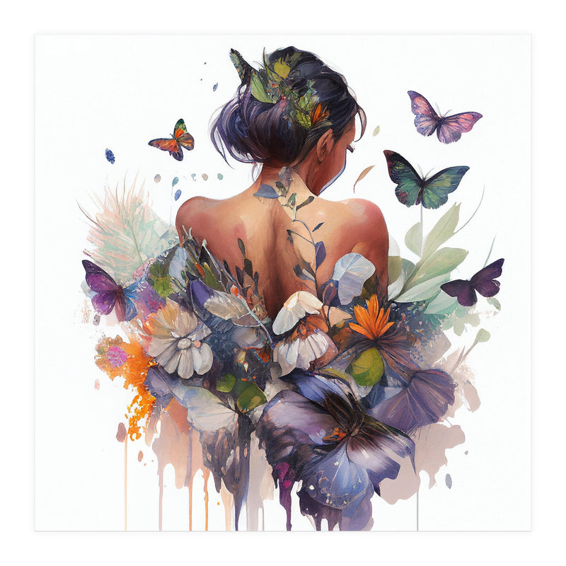 A luminous back portrait surrounded by butterflies and botanical blooms in a refined watercolor style look. Clean negative space and soft color create an elegant contemporary accent for calm modern interiors.