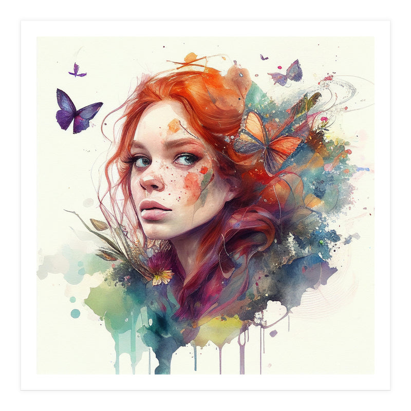 Close up watercolor portrait of a young woman with red hair in a gentle three quarter pose as butterflies and light botanicals gather near the temple. An open background with transparent washes keeps the features crisp while subtle paper texture and fine lines add a refined contemporary look for calm interiors.