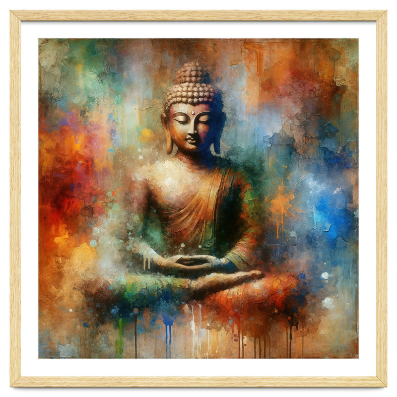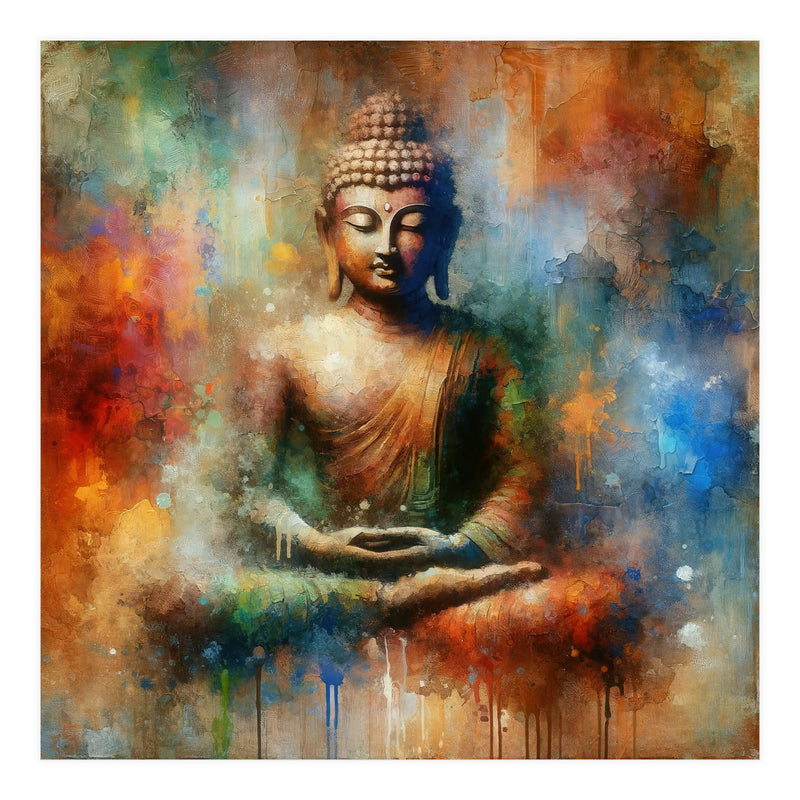 Seated Buddha surrounded by a glowing cloud of teal and warm color, with soft features and closed eyes that create a calm meditative focal point for contemporary interiors.