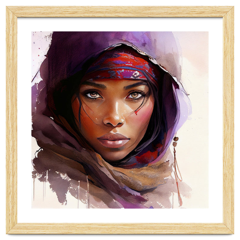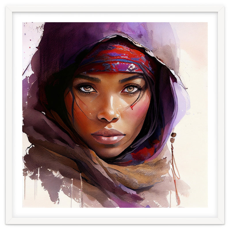 Close up watercolor portrait of a Tuareg woman wrapped in an amethyst hood and layered scarf. Transparent washes reveal paper texture while fine lines define lashes, lips, and fabric folds. Warm desert browns meet cool violets, keeping the steady gaze bright and clear for a refined contemporary focal point.