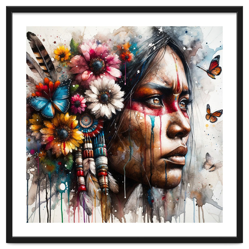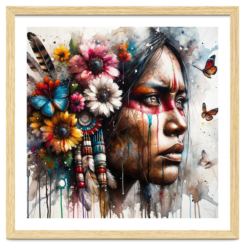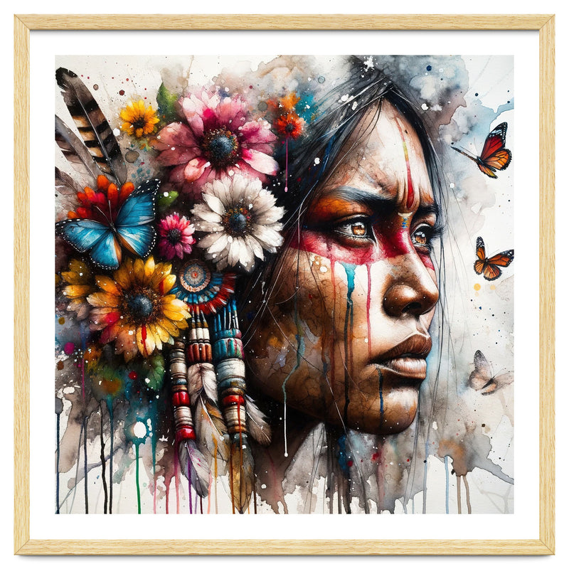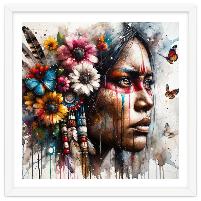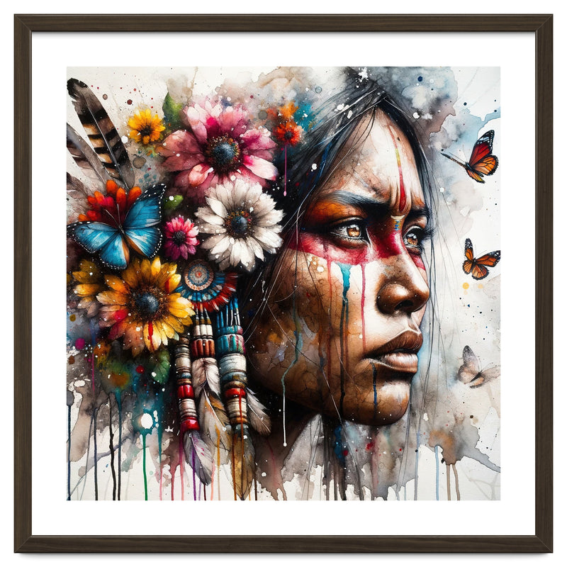 Close up watercolor portrait of a determined young woman in three quarter view with a crimson facial mark. A floral crown, soft feathers, and beadwork frame the temple while butterflies hover in clean negative space. Transparent washes and crisp edges keep the silhouette clear at large scale for an elegant contemporary focal point.