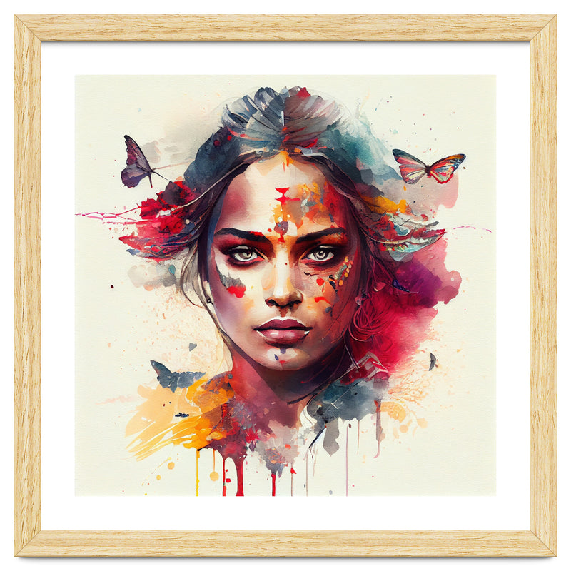 Frontal portrait with a clear bindi and bright butterflies framing the face. Saffron rose and teal sweep across the cheeks while open background preserves clean negative space for crisp large scale display. Refined lines keep an elegant contemporary focus.