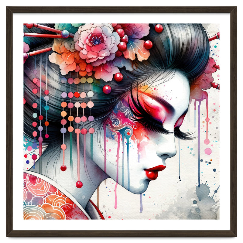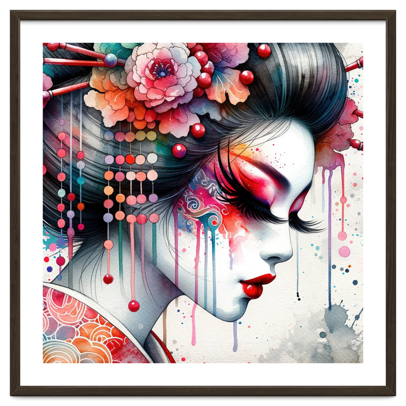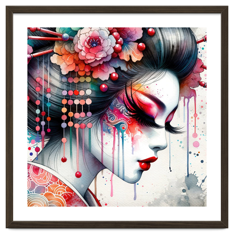 Close up watercolor portrait of a modern geisha in side view. Blossoms and lacquered hairpins crown a neat bun while a strand of beads frames the cheek. Transparent washes and clean negative space keep the contour crisp at large scale, creating an elegant contemporary focal point.