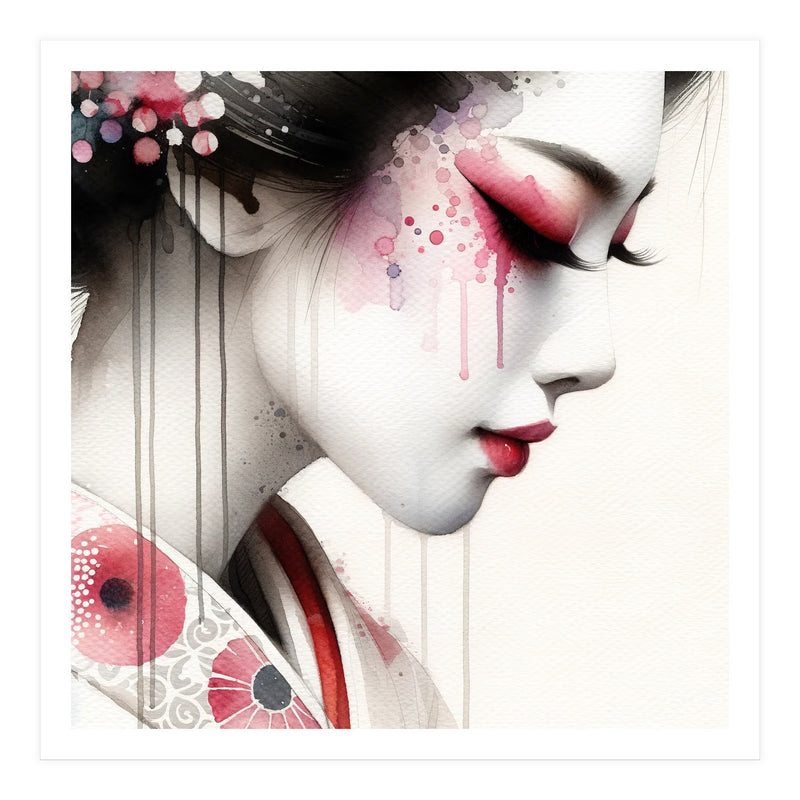 Close up watercolor portrait of a modern geisha in quiet side view. Soft rose washes shape eyelid and cheek while delicate droplets drift near the temple. A refined floral kimono pattern adds texture and the open background preserves clean negative space, keeping the silhouette crisp at large scale for elegant contemporary interiors.