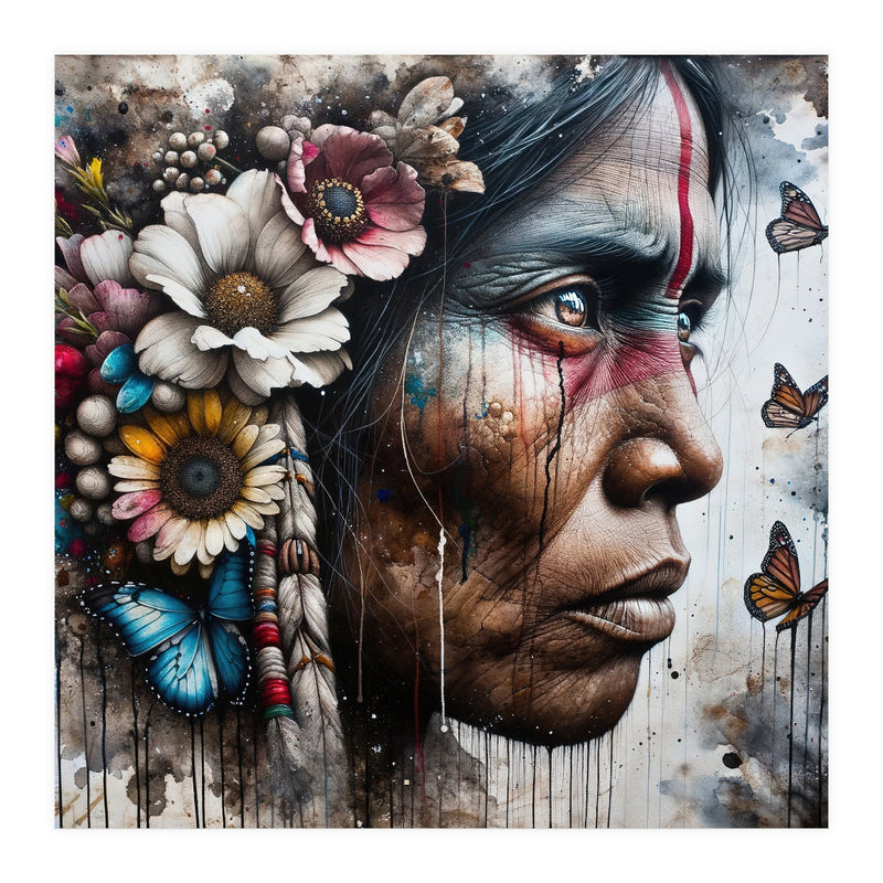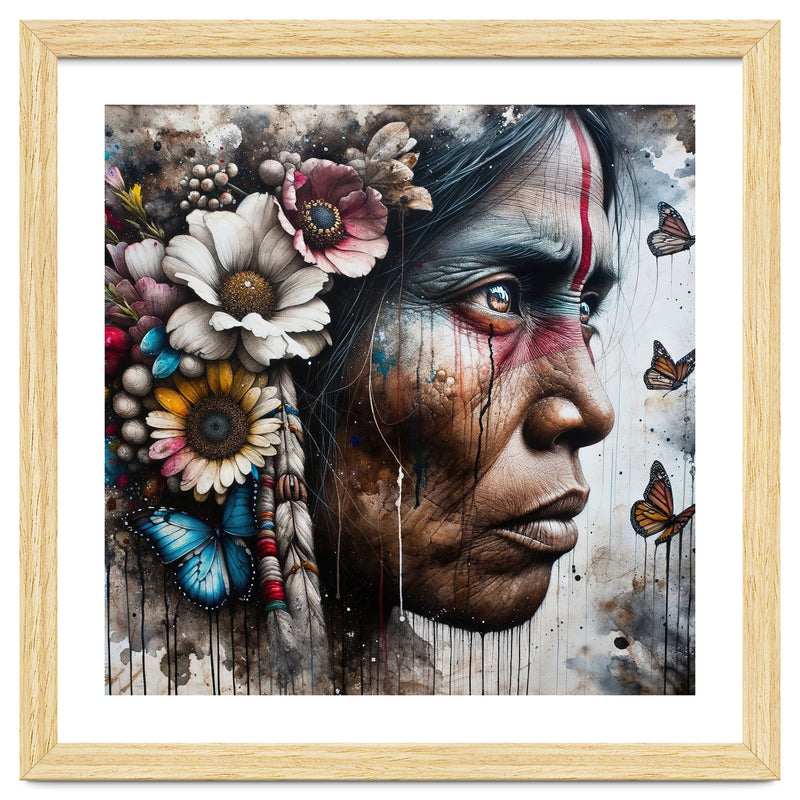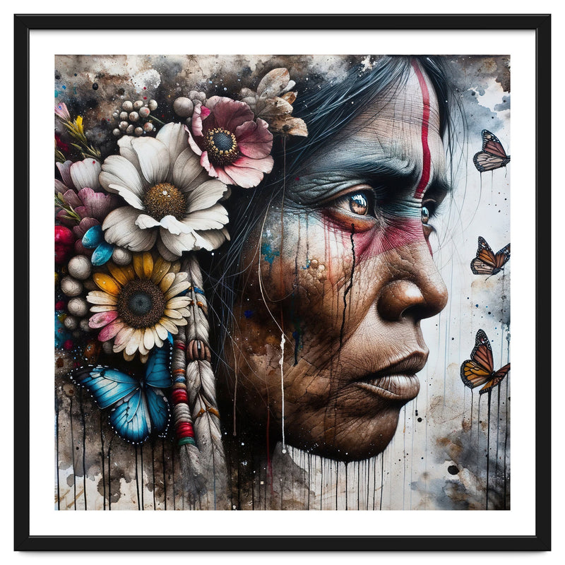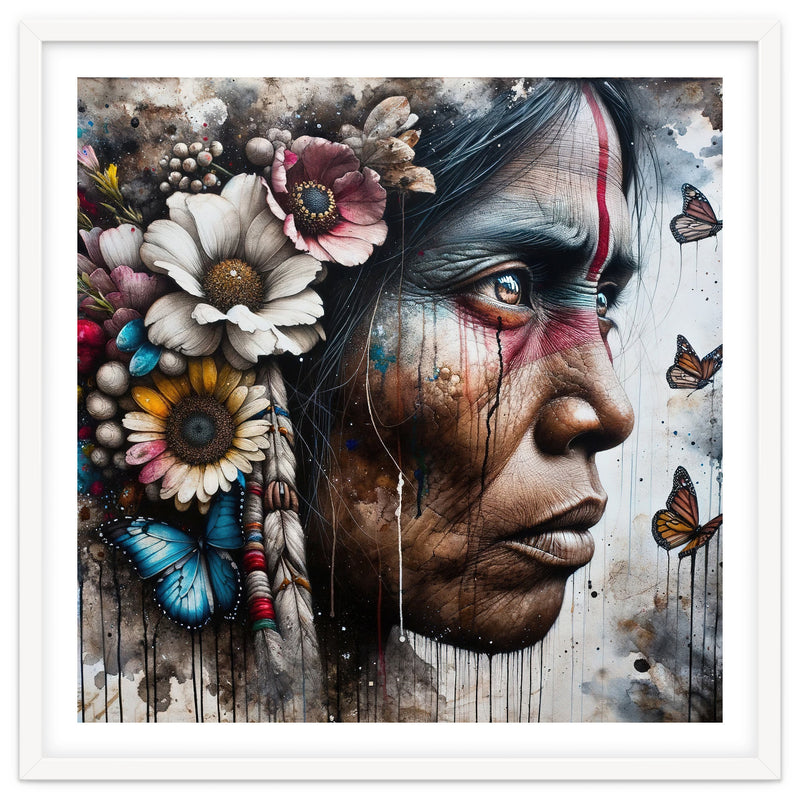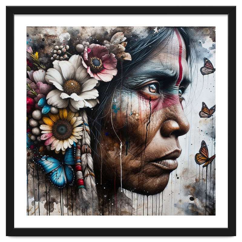 Close up watercolor portrait of an elder woman in side view framed by wild flowers, soft feathers, and drifting butterflies. Transparent washes keep skin texture natural and dignified while clean negative space preserves a crisp silhouette at large scale. Fine details in petals, feather edges, and subtle beadwork add tactile realism for contemporary interiors.
