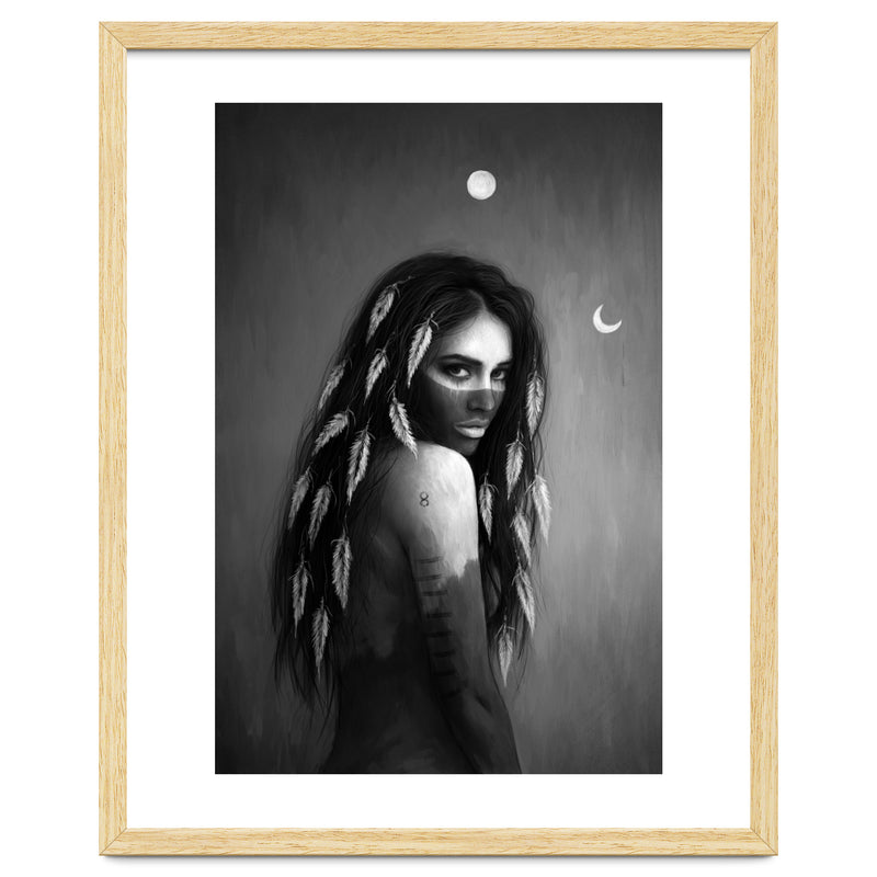 Black and white portrait of a woman with white feathers tied into her long dark hair.