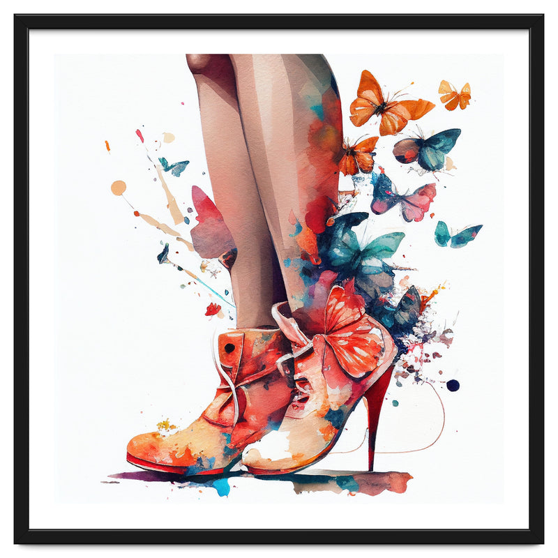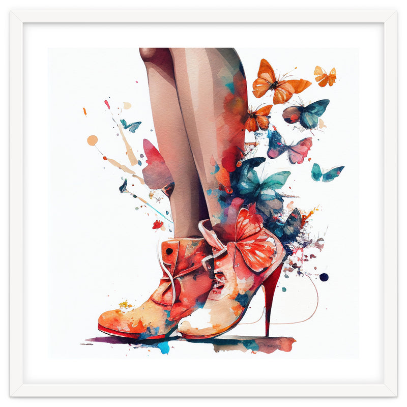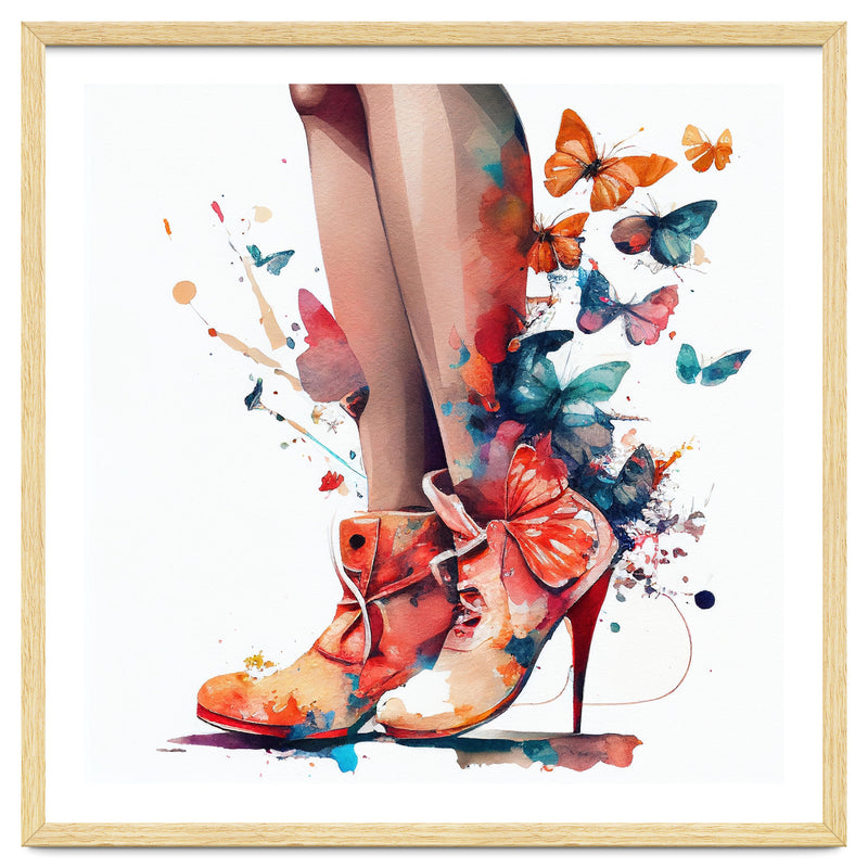 Close up watercolor composition focused on legs and high heels as a burst of butterflies lifts from the ankles. Open negative space keeps the silhouette crisp while transparent washes and controlled splashes suggest motion. Coral and turquoise passages add a lively accent, creating a clean contemporary focal point for modern interiors.