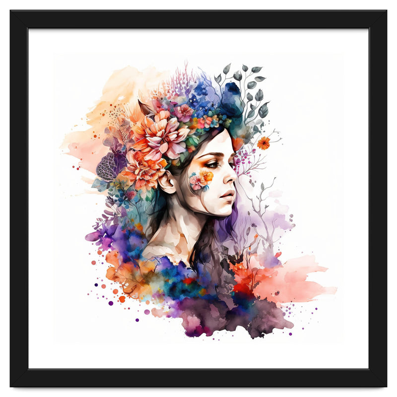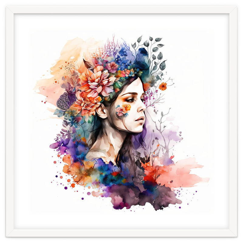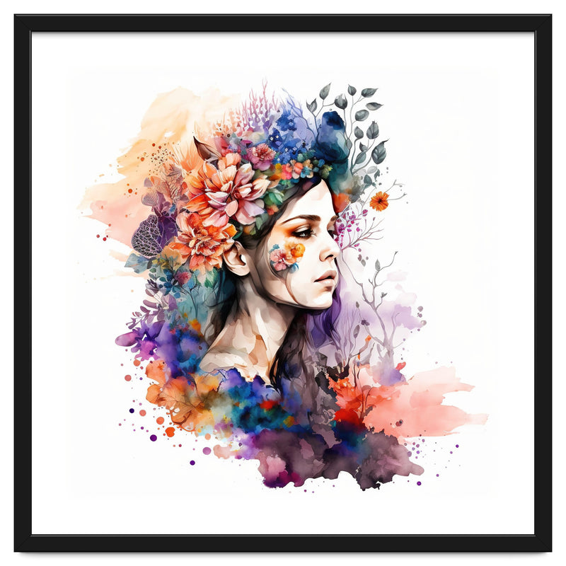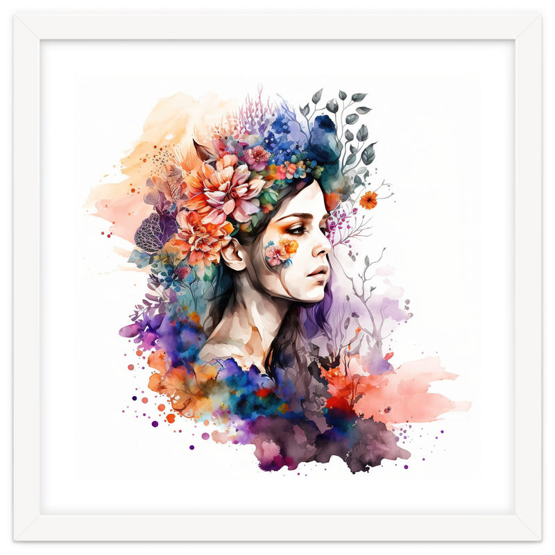 Close up watercolor portrait of a woman emerging from airy washes as violet and blue blooms gather around the temple and cheek. Soft gradients and generous negative space keep the profile crisp while transparent layers reveal subtle paper texture, creating a refined contemporary focal point for calm interiors.