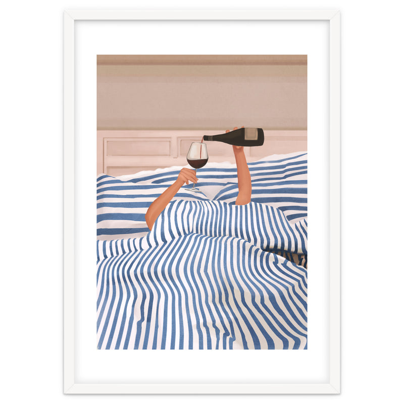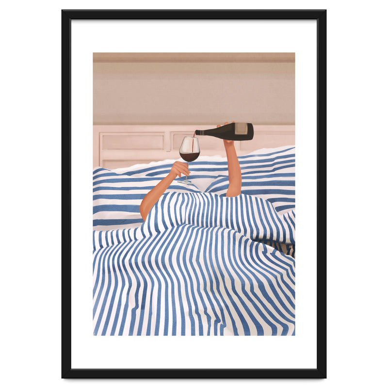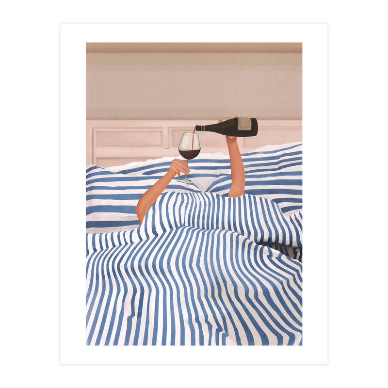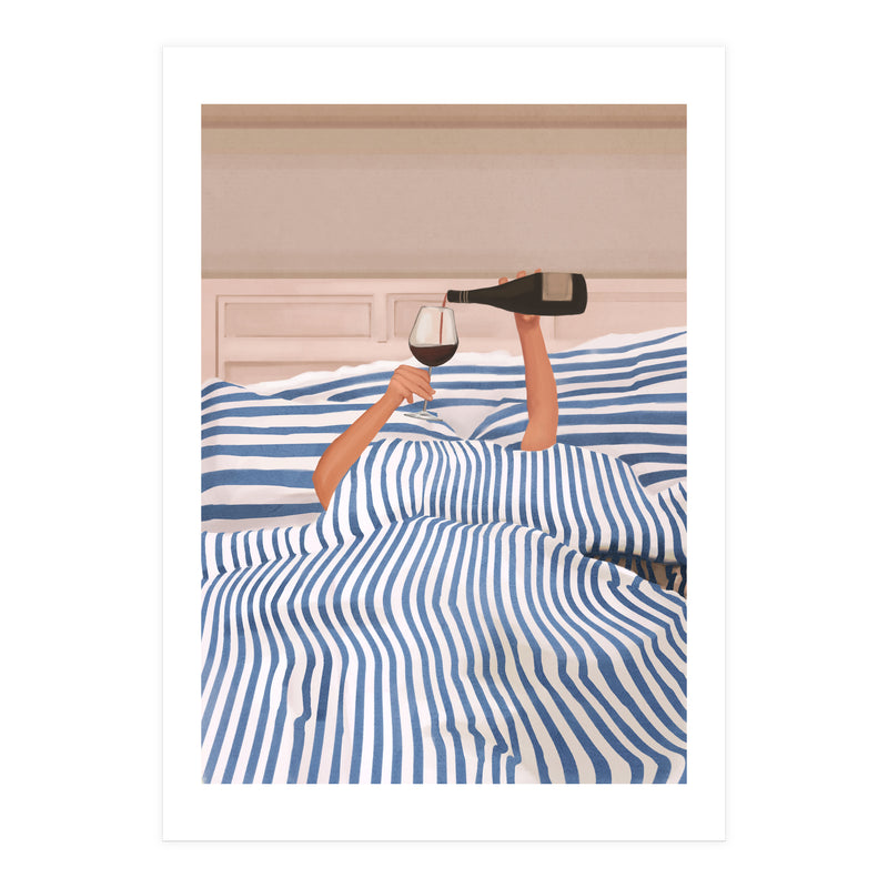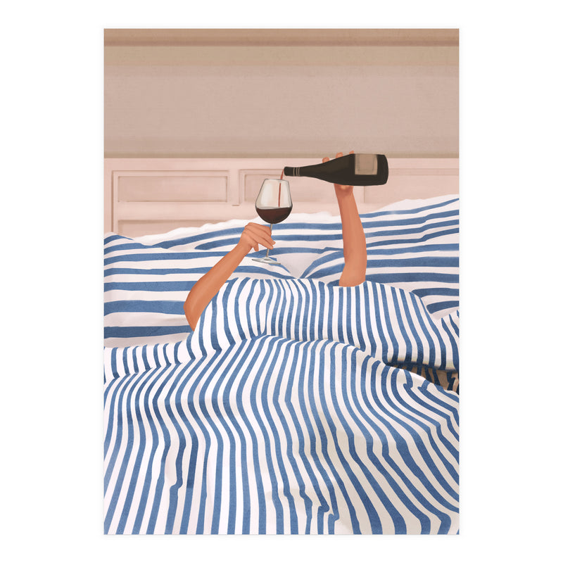 A playful and minimalist illustration of a cozy morning in bed, where only two arms emerge from blue striped sheets to pour a glass of red wine. The composition blends humor and elegance, capturing indulgent relaxation.