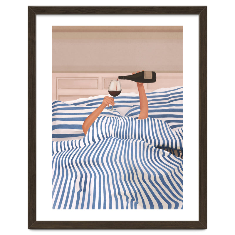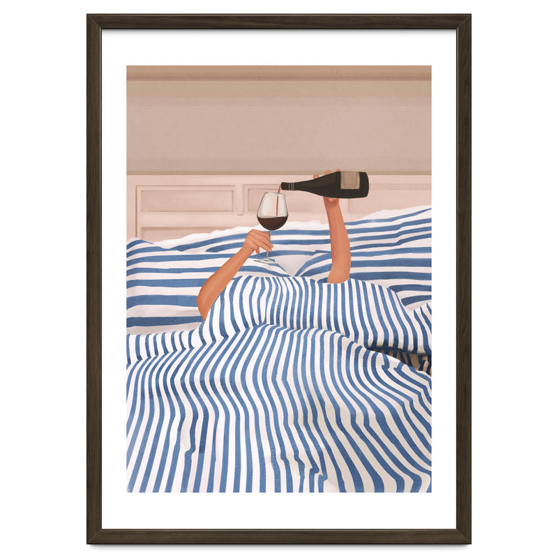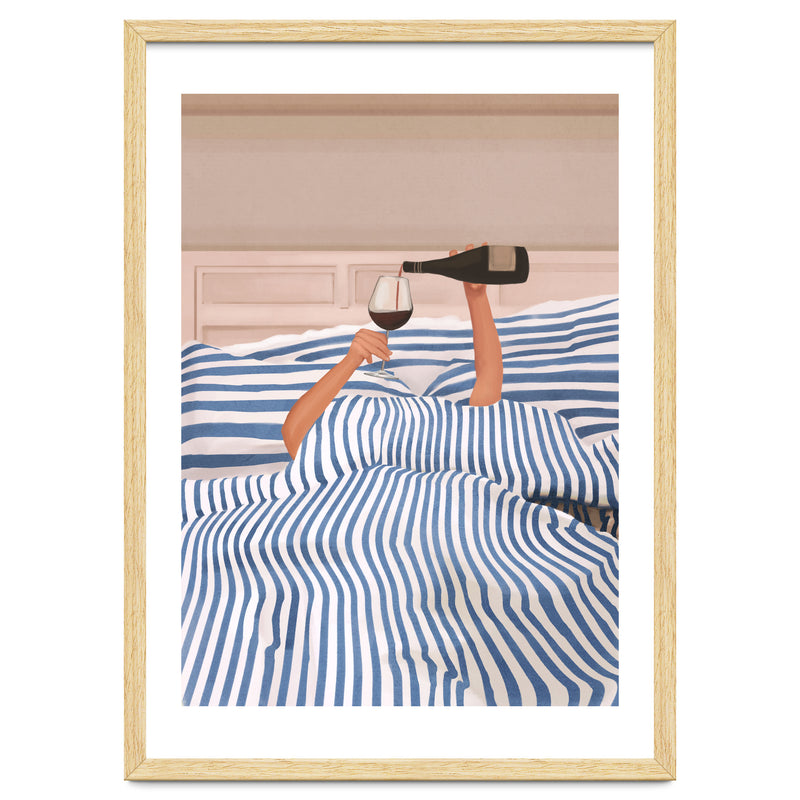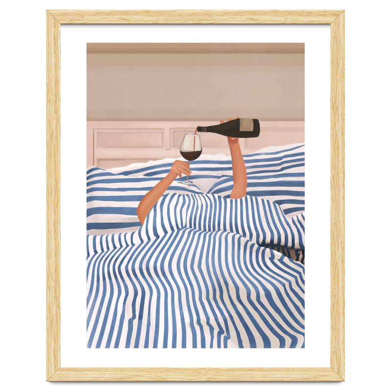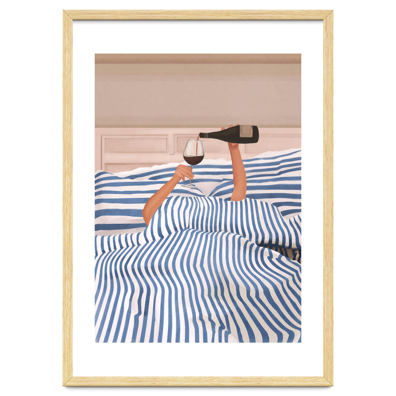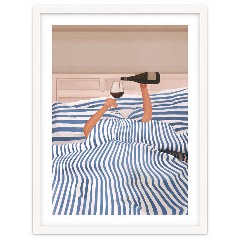 A playful and minimalist illustration of a cozy morning in bed, where only two arms emerge from blue striped sheets to pour a glass of red wine. The composition blends humor and elegance, capturing indulgent relaxation.