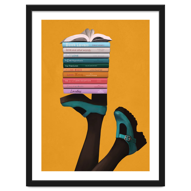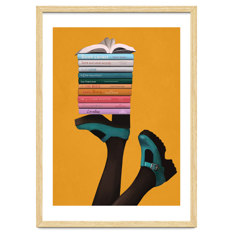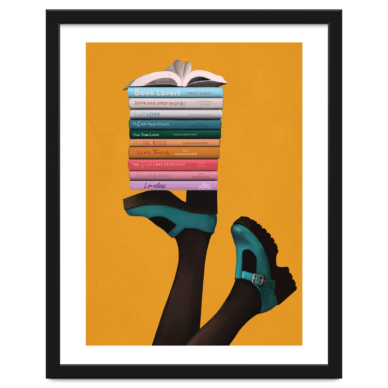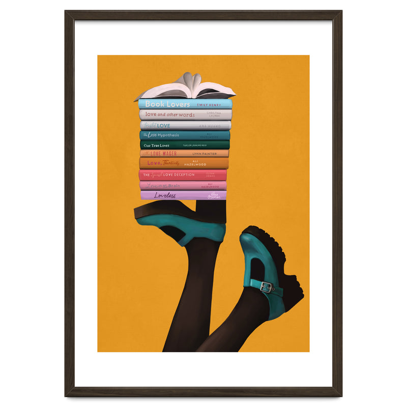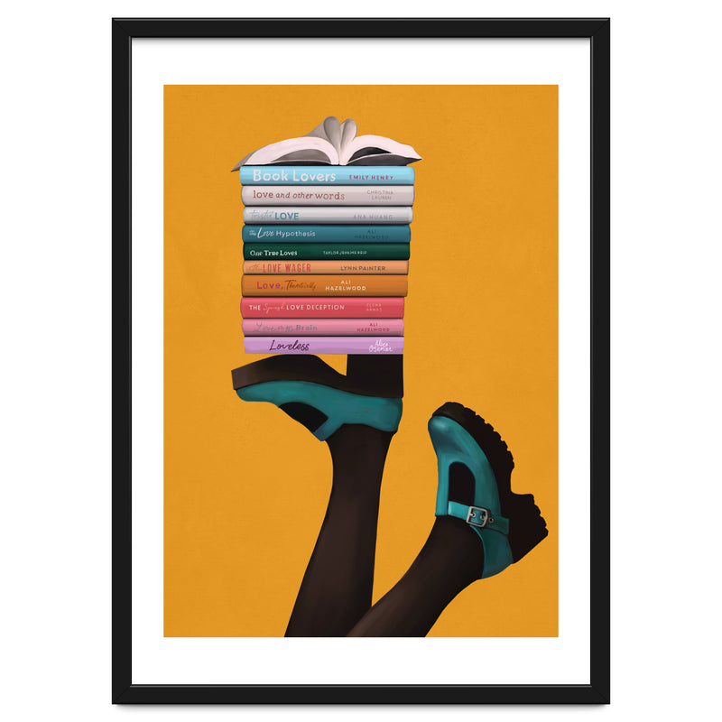 A bold, contemporary illustration of a woman’s legs lifted playfully in the air, balancing a colorful stack of romance novels. The vibrant background enhances the confident, bookish charm of the composition.