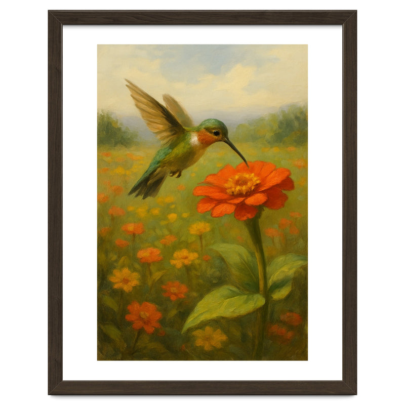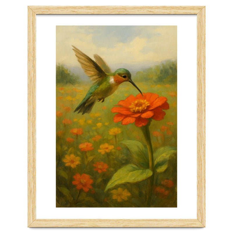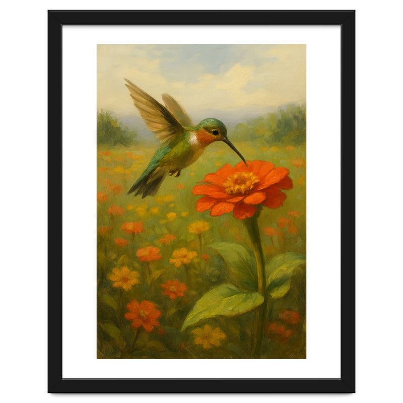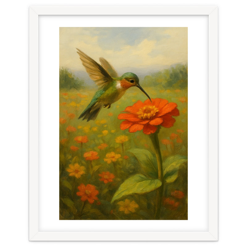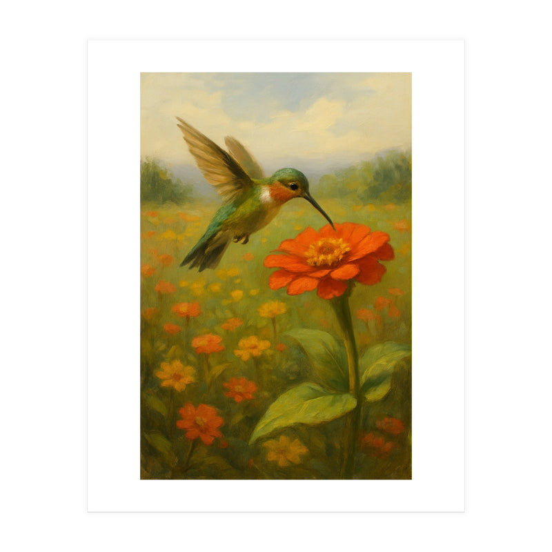 This painting captures a moment of pure harmony between nature and home. Through an open wooden window, the viewer is invited into a lush garden bathed in soft sunlight. In the foreground, a delicate pink blossom rests on the windowsill, visited by a hummingbird in mid-flight. Beyond, vibrant greenery and distant birds in the sky complete the idyllic scene, evoking freedom and tranquility. The warm tones of the interior blend seamlessly with the vivid freshness of the garden, creating a contrast between the calm intimacy of the room and the boundless beauty of nature outside. Every brushstroke conveys peace, renewal, and the gentle rhythm of life. A timeless work that symbolizes serenity, connection with nature, and the joy of simple beauty — perfect for collectors who appreciate paintings that bring light, air, and inspiration into their living space.