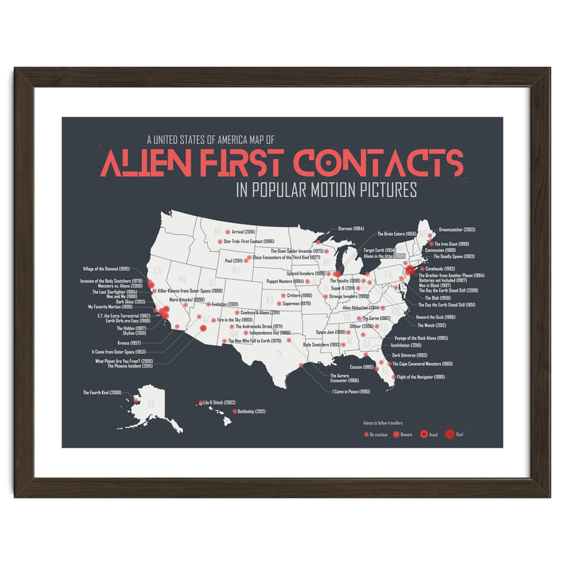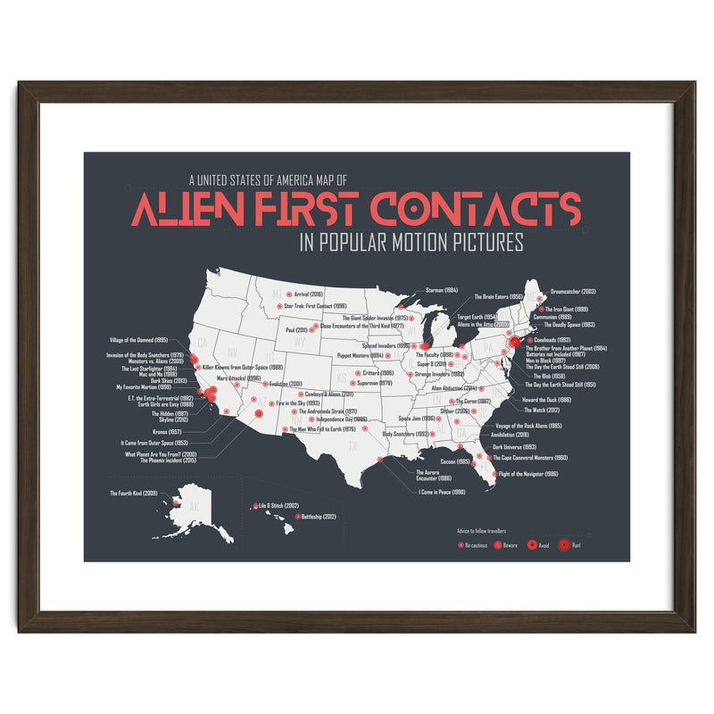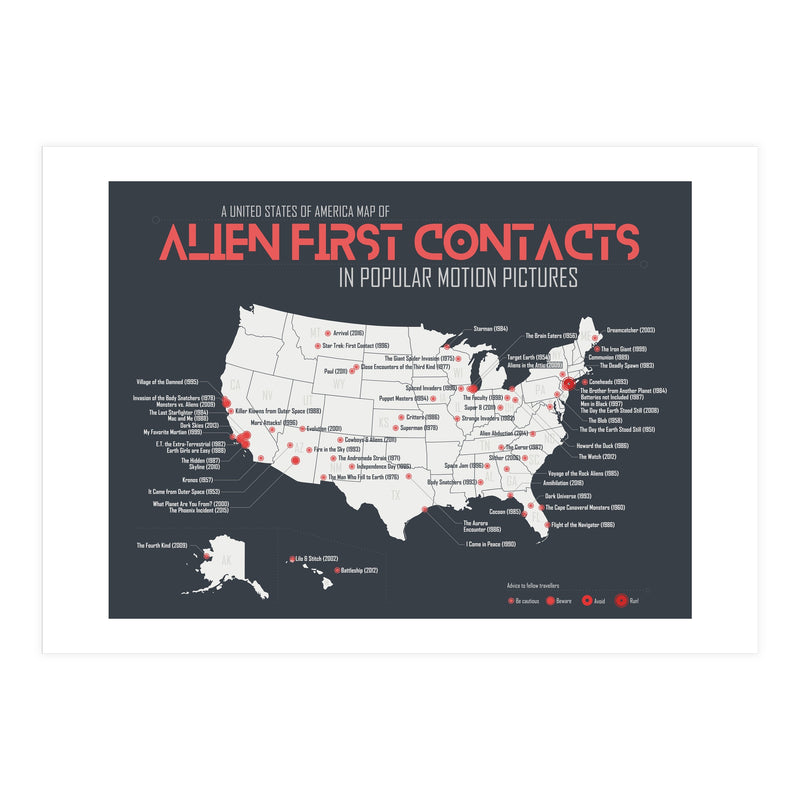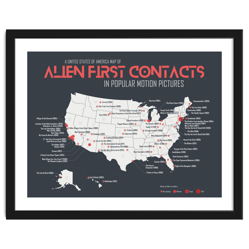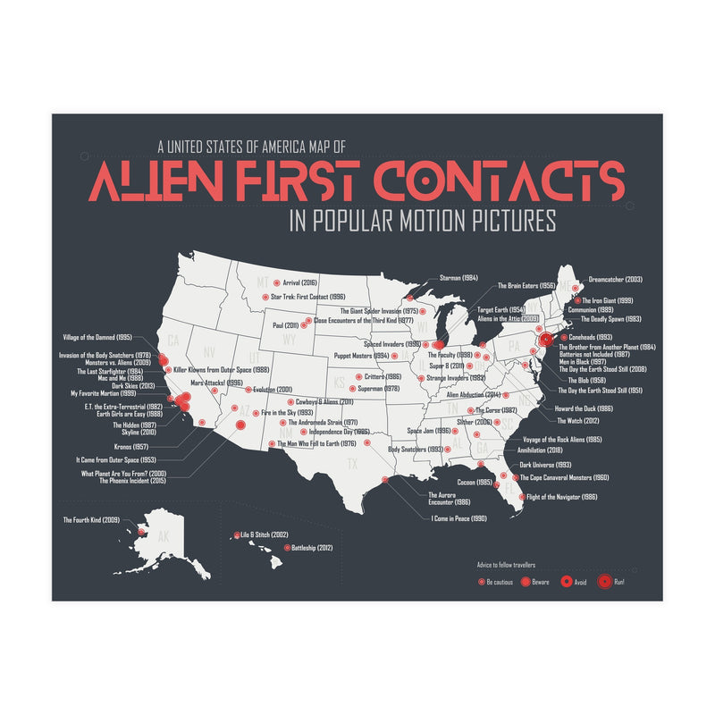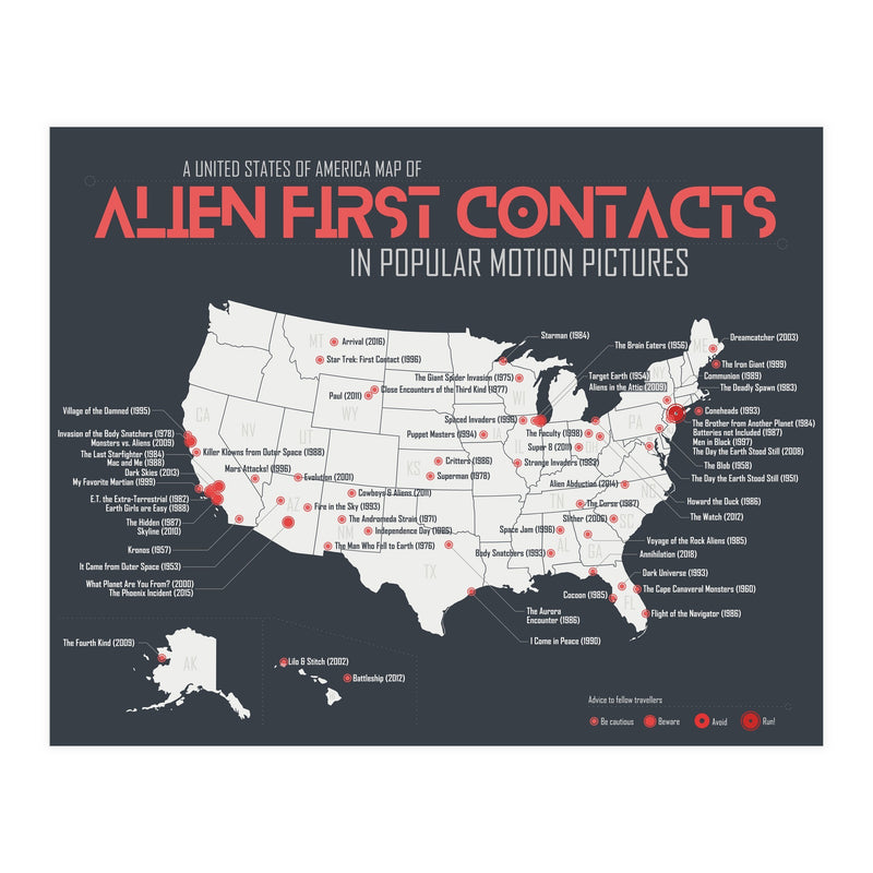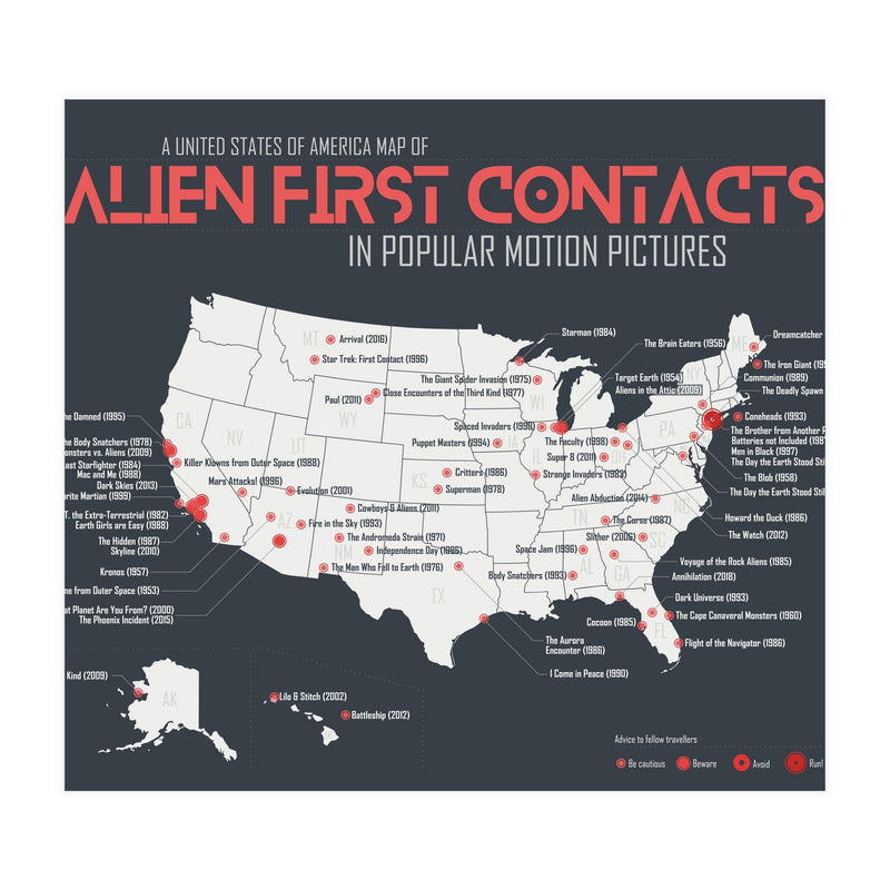When aliens land on earth in films, it's usually in the US, but where exactly? A USA map of first contacts in movies, from blockbuster to forgotten films.