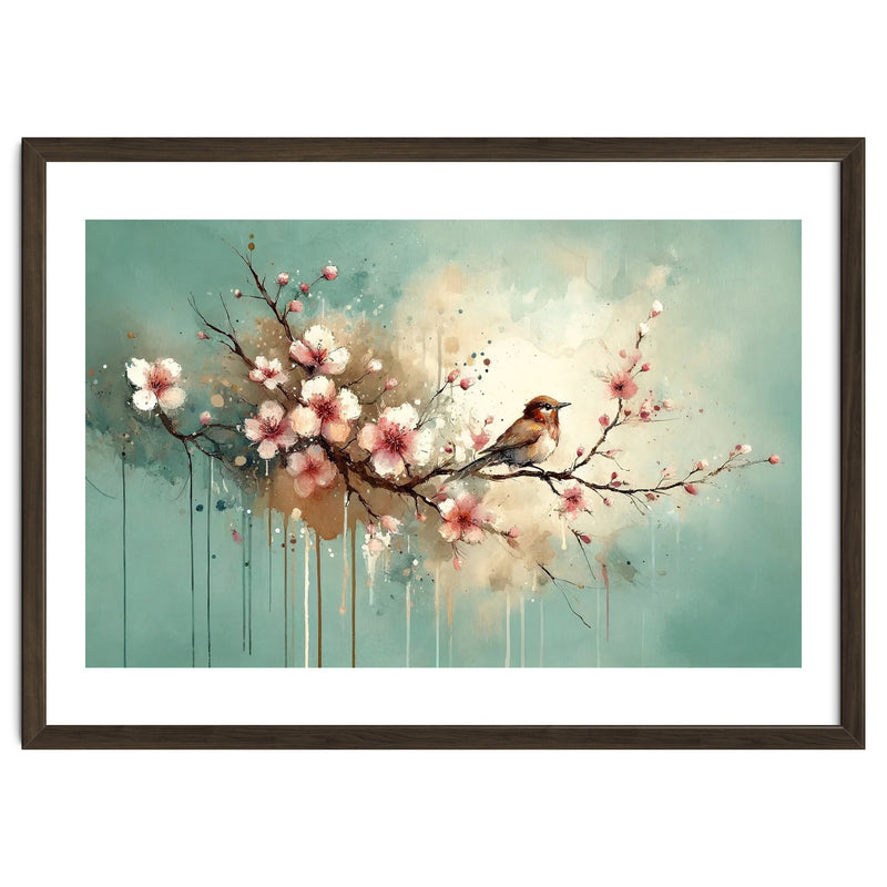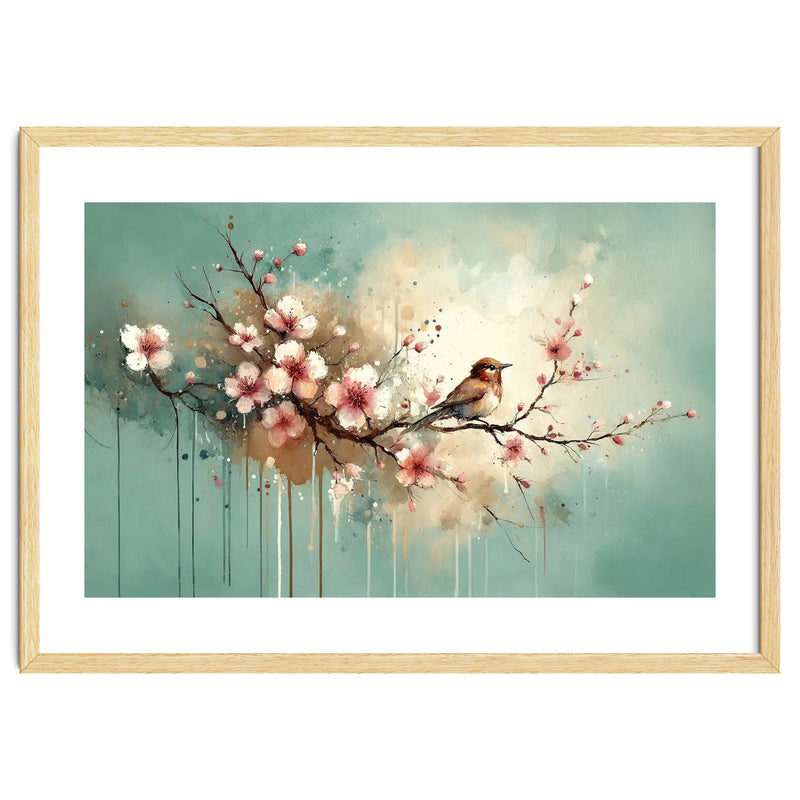 A delicate bird perched on a cherry blossom branch with soft petals and a clean teal background. Pastel tones, fine feather detail, and airy negative space create a calm nature accent for contemporary interiors.