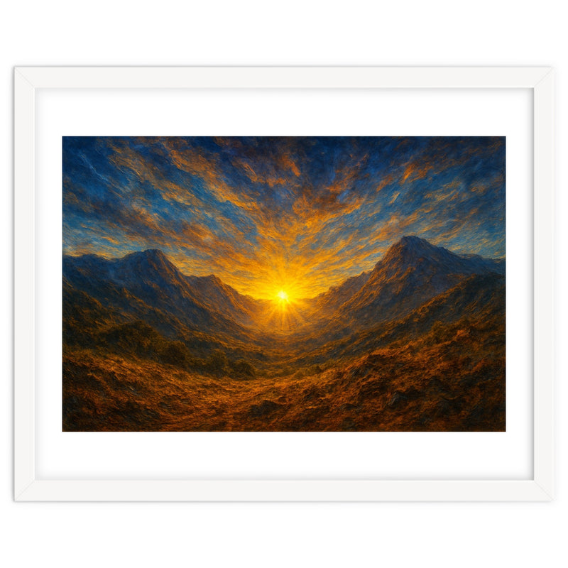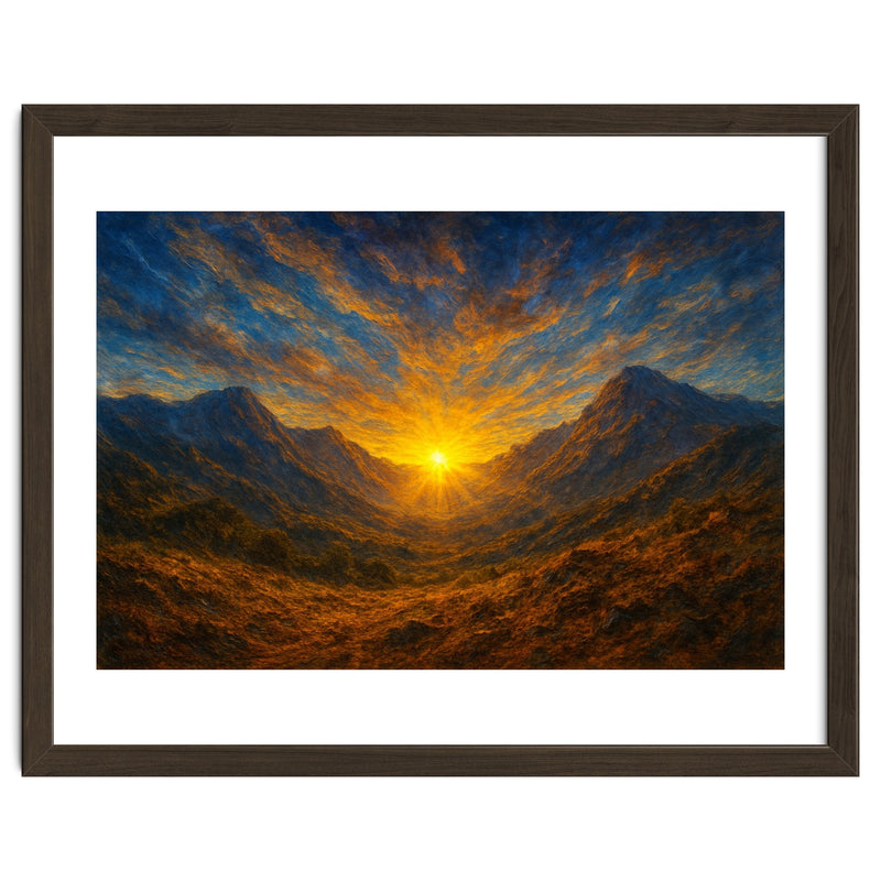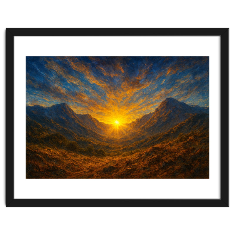 Part of the “Symphony of the Elements,” this piece embodies Air — the unseen rhythm of freedom and inspiration. Between two timeless peaks, light ascends, filling the sky with golden radiance. “Breath of the Mountains” celebrates movement, elevation, and the power of change carried by the wind. Technique: digital oil painting, luminous brushwork, dynamic light contrasts.