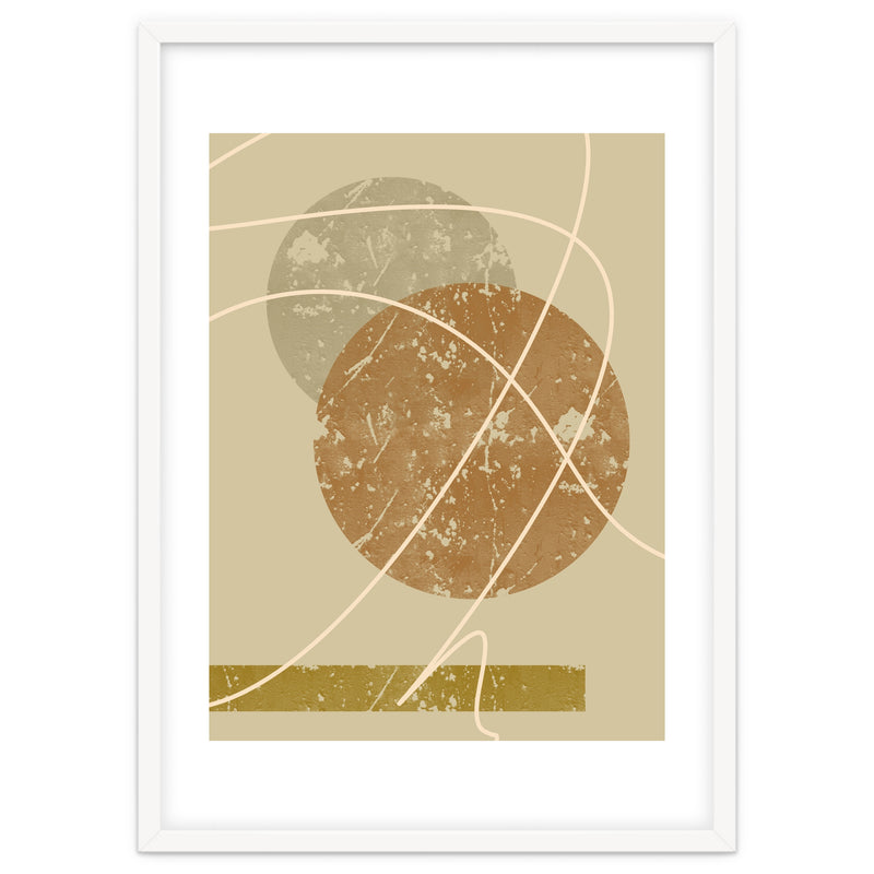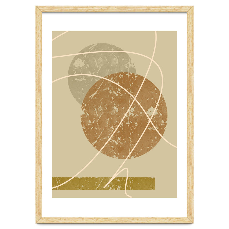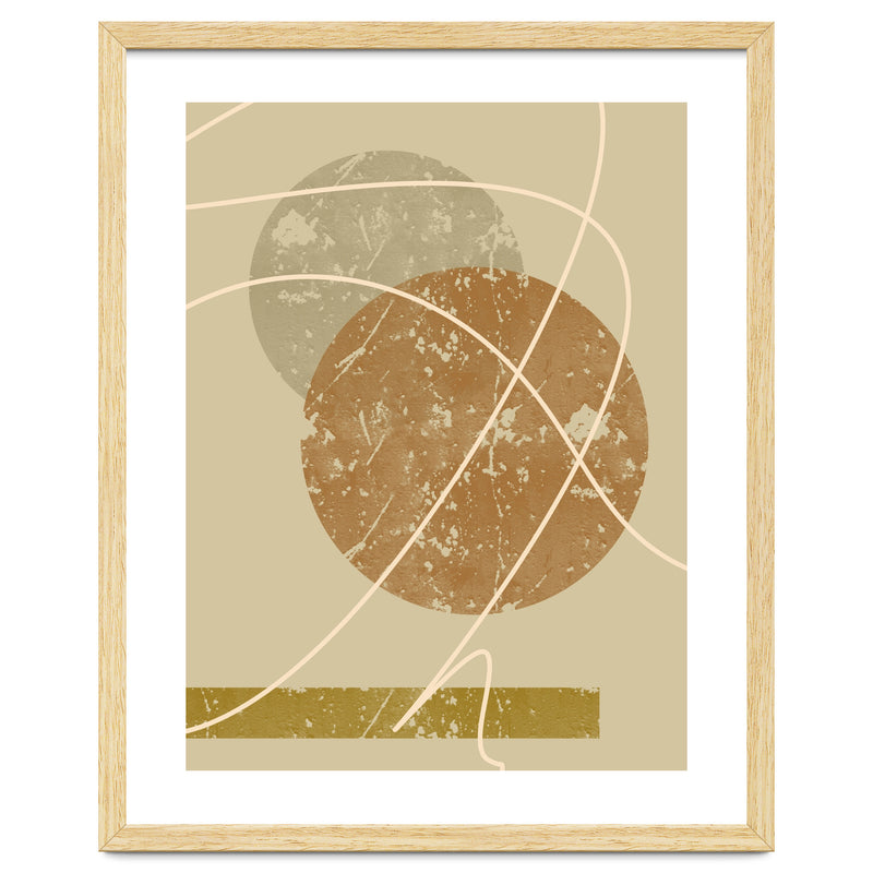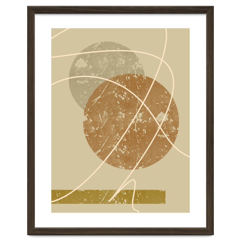 An abstract composition combining circular shapes with dynamic lines and rich textures, creating a soothing visual harmony in a neutral color palette.