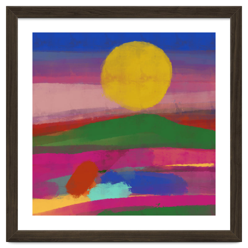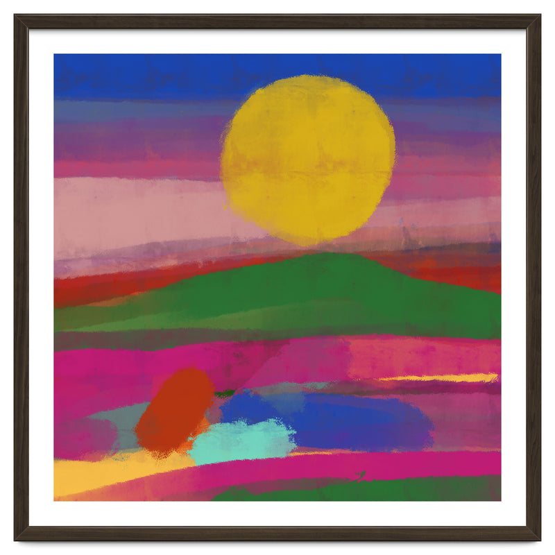 This colorful digital painting captures a striking abstract sunset or sunrise. Bold strokes of fuchsia, electric blue, and deep purple contrast vividly with the bright yellow orb and green hills, creating a dynamic, modern landscape with intense emotional depth.