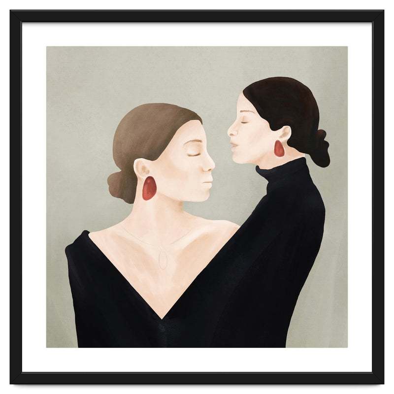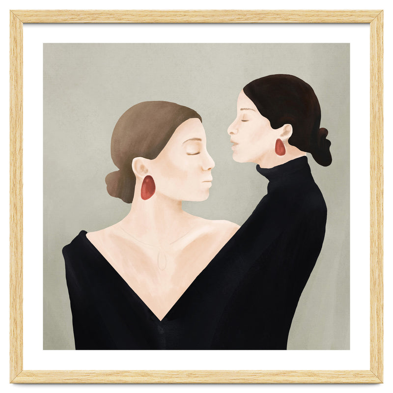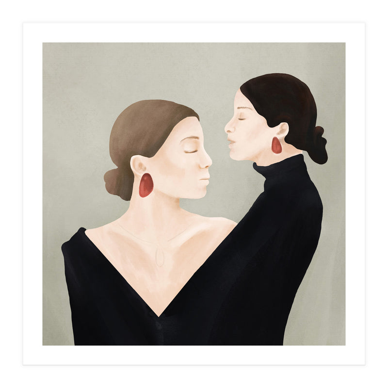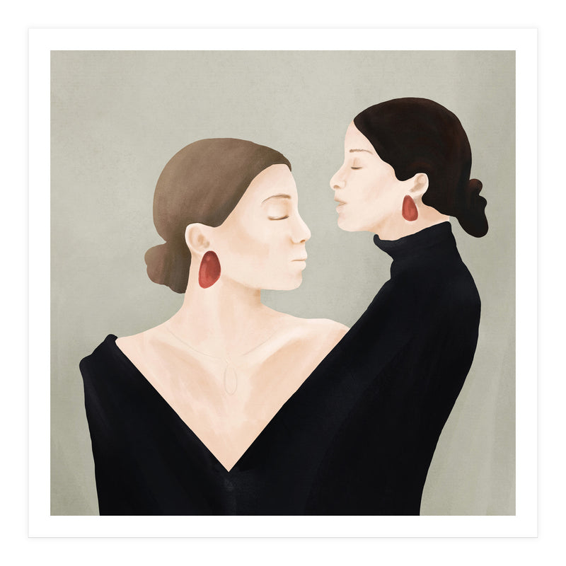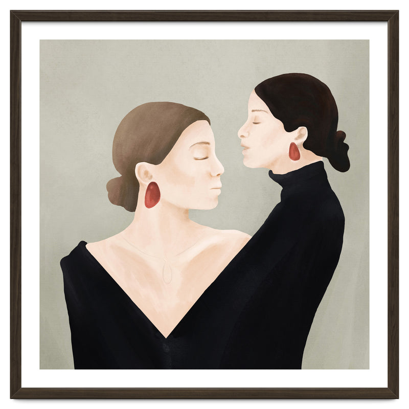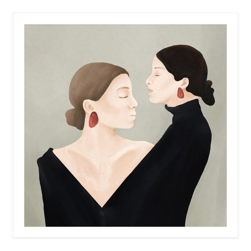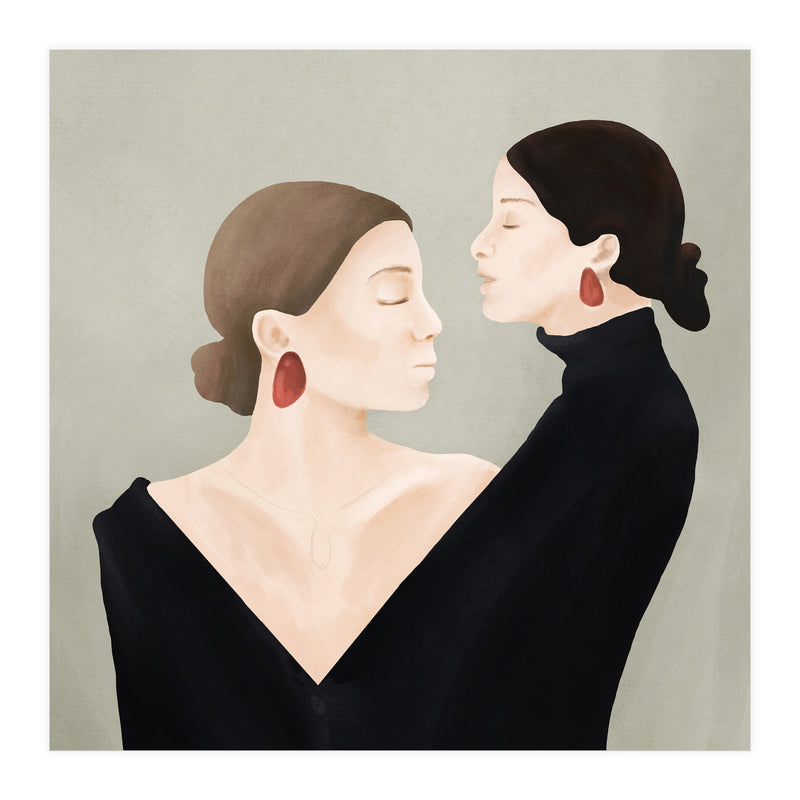 A refined and minimal illustration of two women in quiet alignment, their closed eyes and mirrored profiles conveying calm, confidence, and inner balance. Soft textures and subtle contrasts create a timeless, contemplative mood.