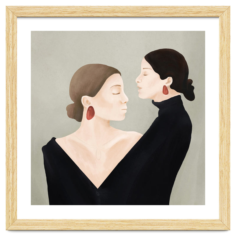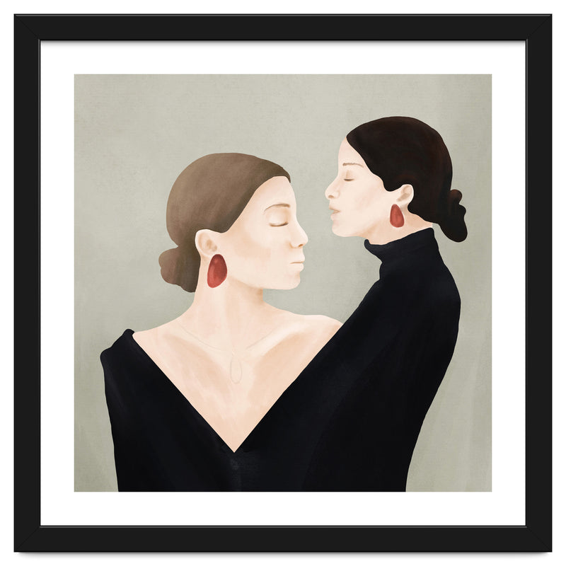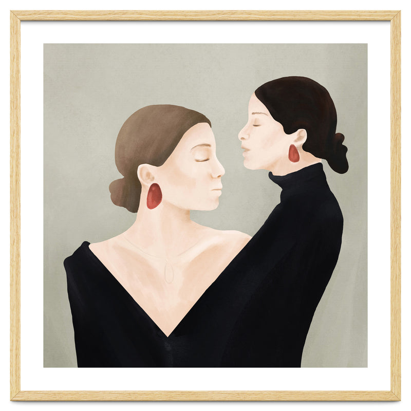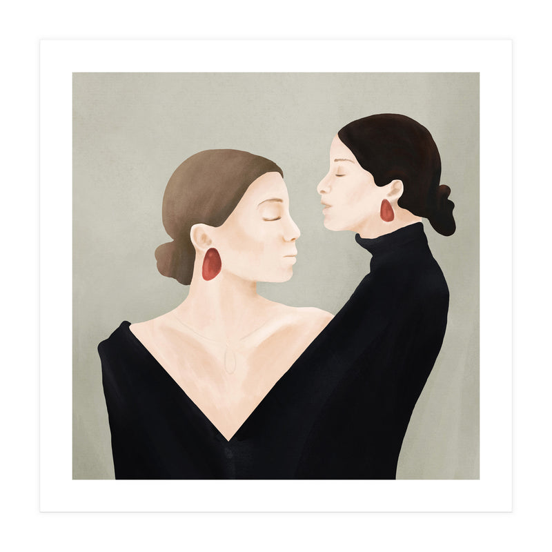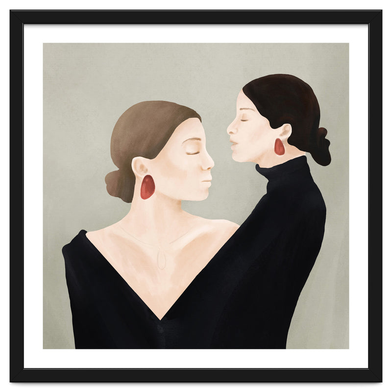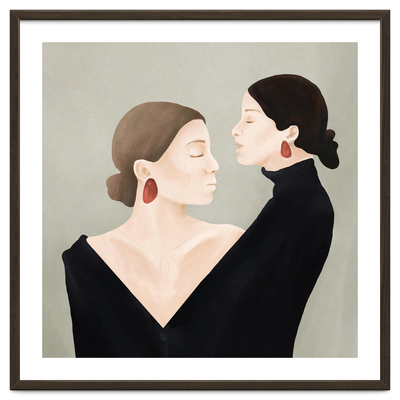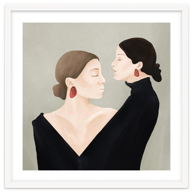 A refined and minimal illustration of two women in quiet alignment, their closed eyes and mirrored profiles conveying calm, confidence, and inner balance. Soft textures and subtle contrasts create a timeless, contemplative mood.