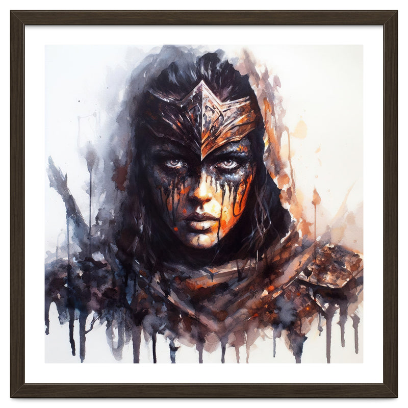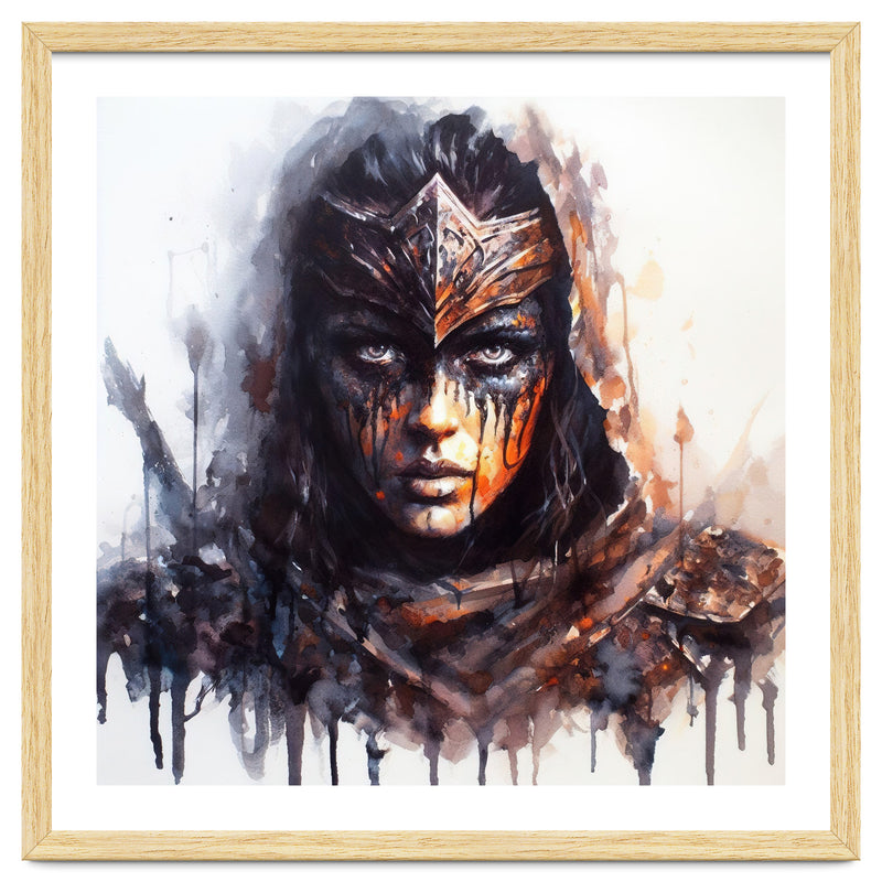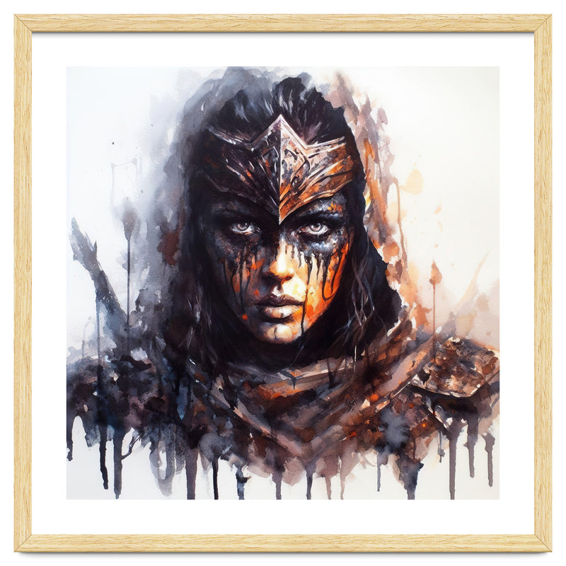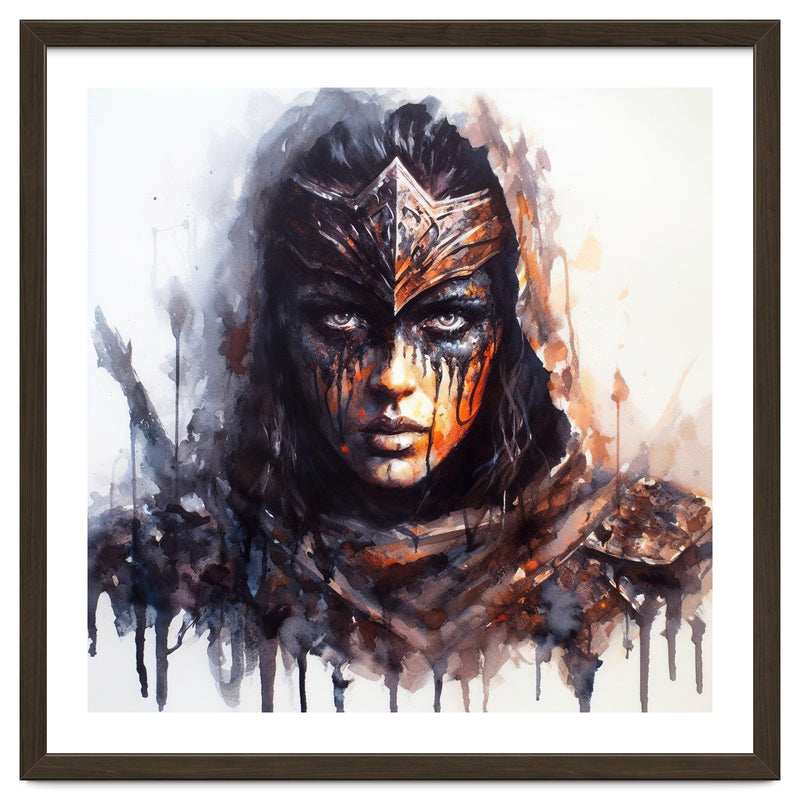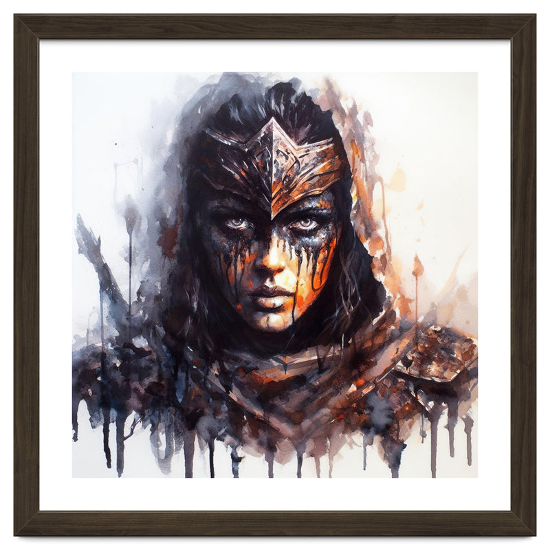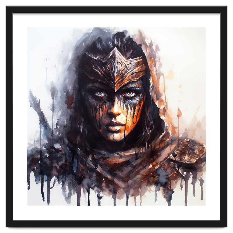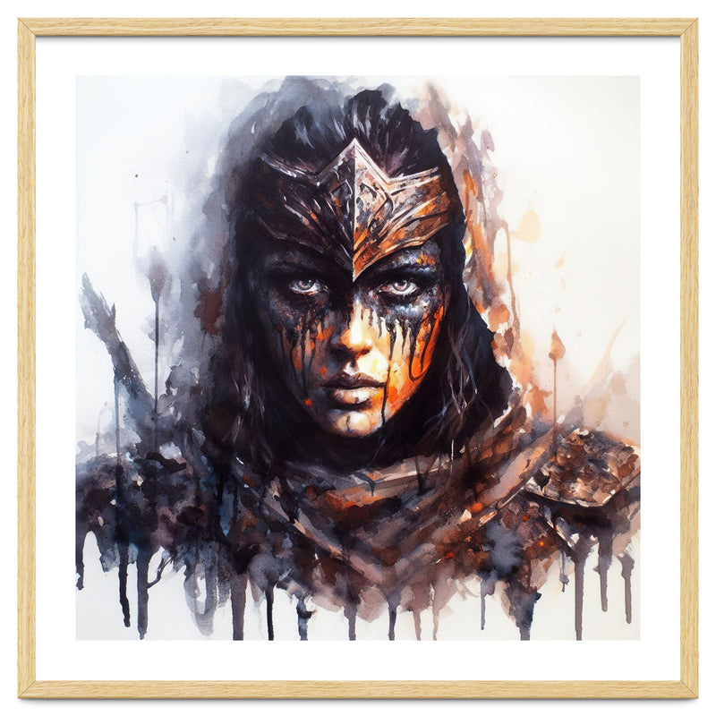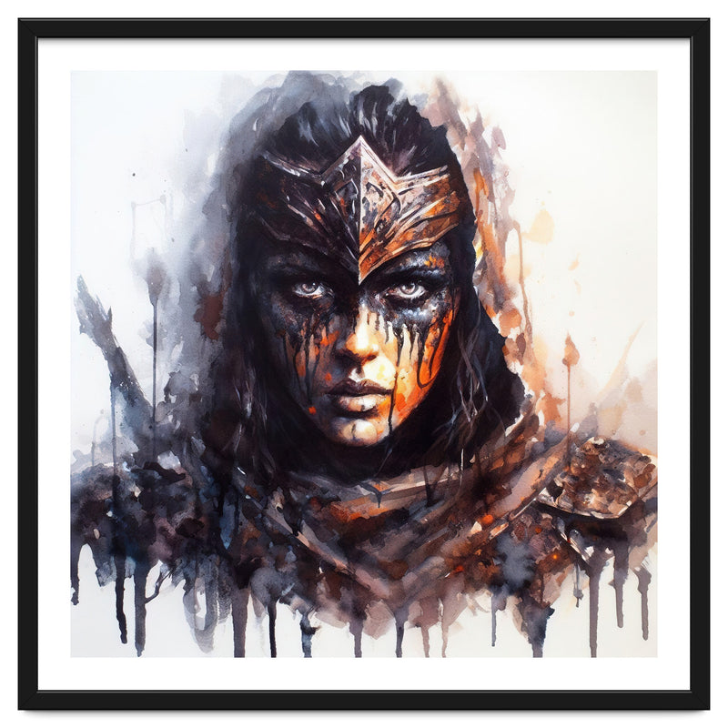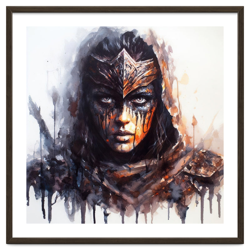 Close up portrait of an armored medieval warrior woman with an ornate helmet, deep shadows and bold watercolor accents. A strong gaze and clean negative space create a striking focal point for modern interiors.