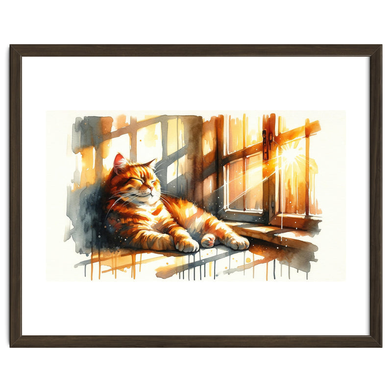 A ginger tabby cat resting on a sunlit windowsill with warm watercolor washes, soft shadows, and delicate whisker details, creating cozy animal wall art for calm modern interiors.