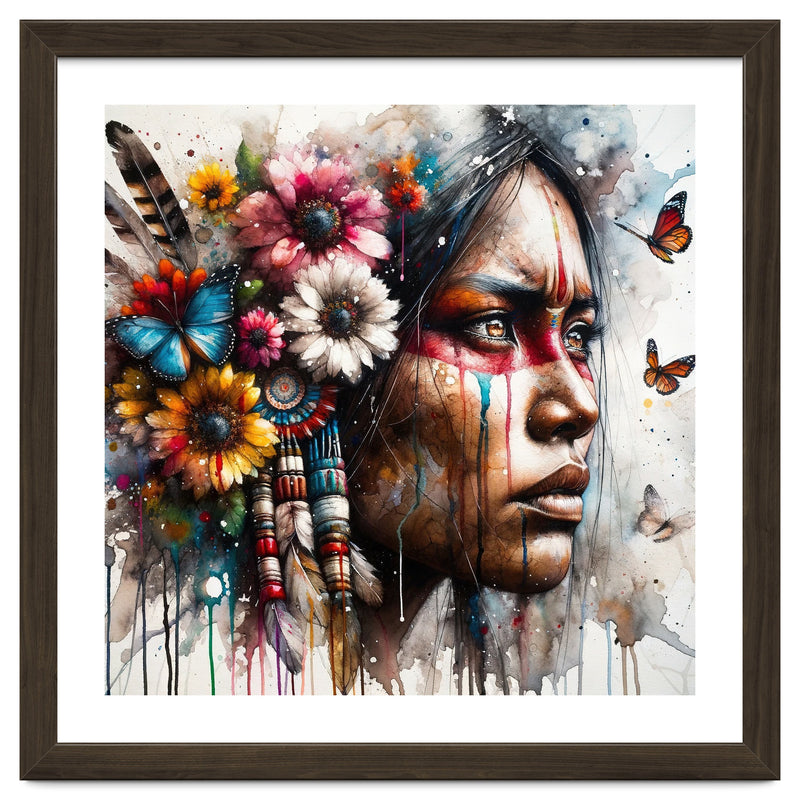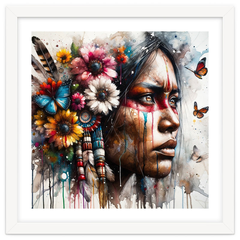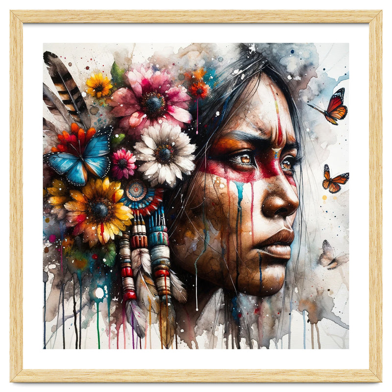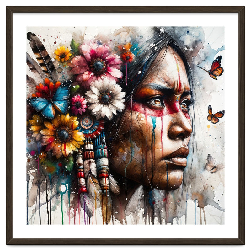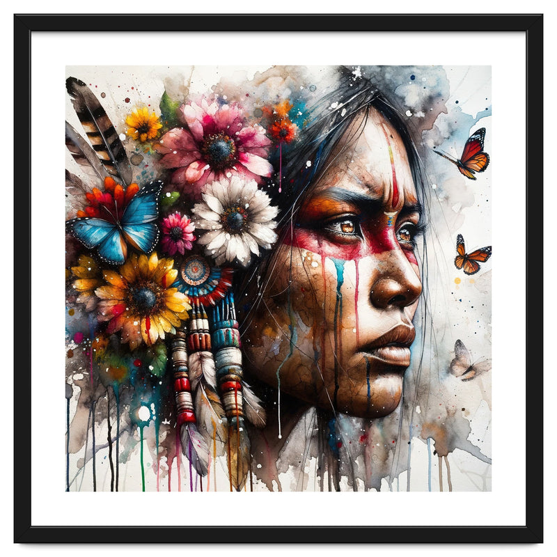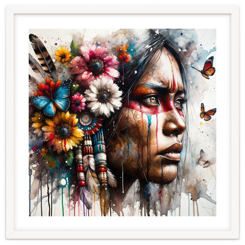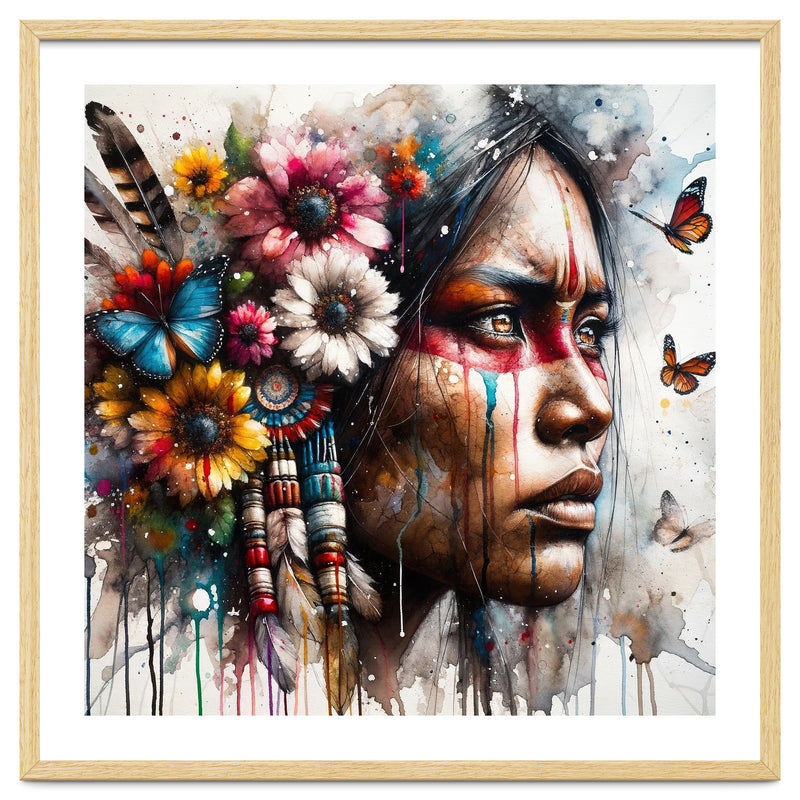 Close up watercolor portrait of a determined young woman in three quarter view with a crimson facial mark. A floral crown, soft feathers, and beadwork frame the temple while butterflies hover in clean negative space. Transparent washes and crisp edges keep the silhouette clear at large scale for an elegant contemporary focal point.