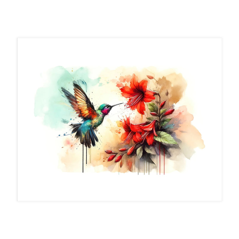 A vibrant hummingbird hovering beside crimson blossoms, with airy washes, delicate splashes, and a light botanical atmosphere that brings fresh energy to any space.