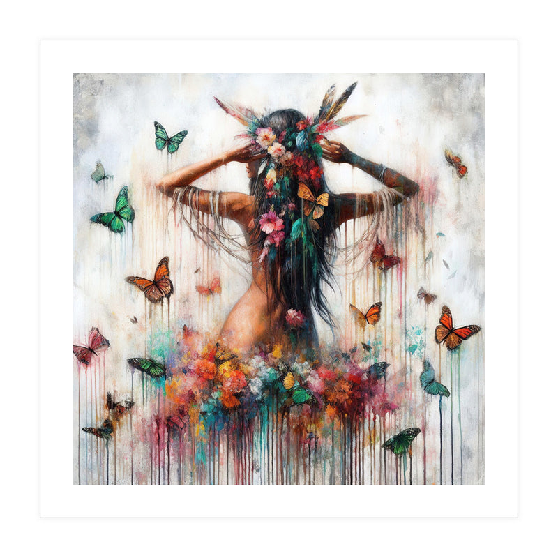 A luminous back portrait with raised arms, blooming florals, and drifting butterflies in a refined watercolor style atmosphere. Soft splashes and clean negative space create an elegant contemporary focal point for calm modern interiors.