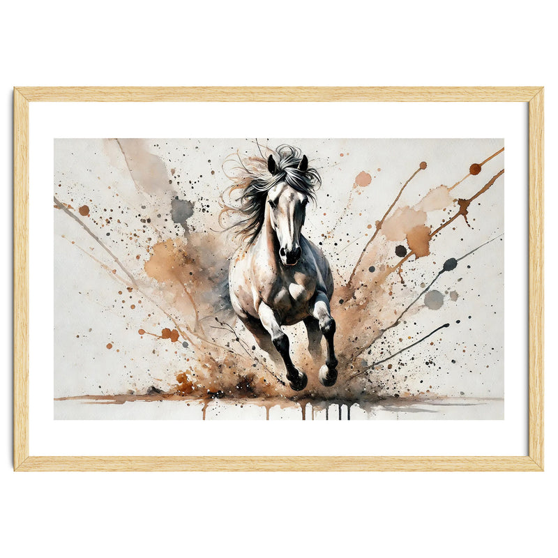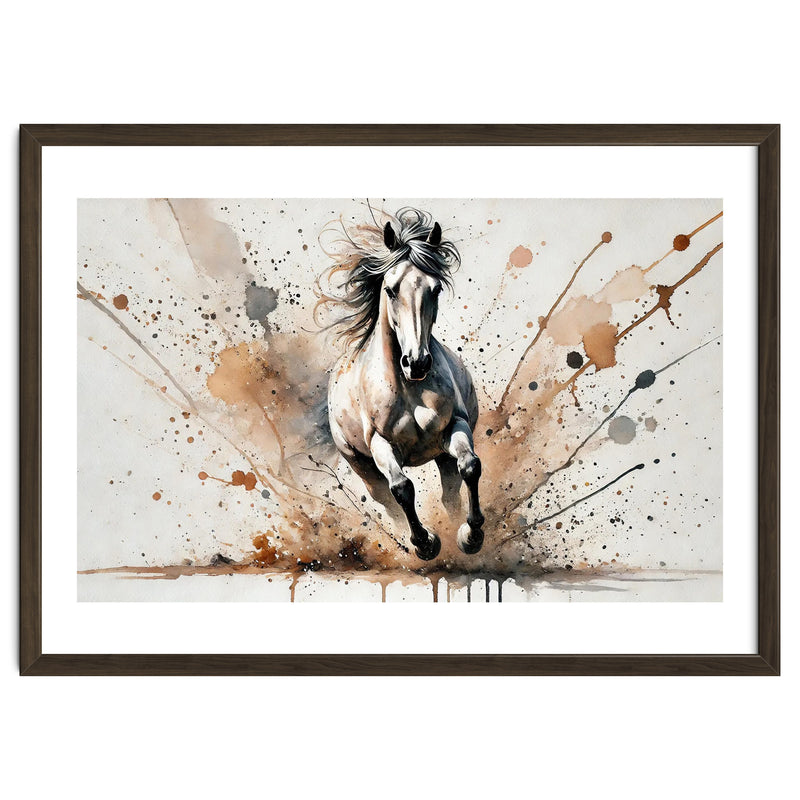 A horse charging forward in a frontal view with flying mane, lifted hooves, earthy splashes, and expressive watercolor washes on a clean background.