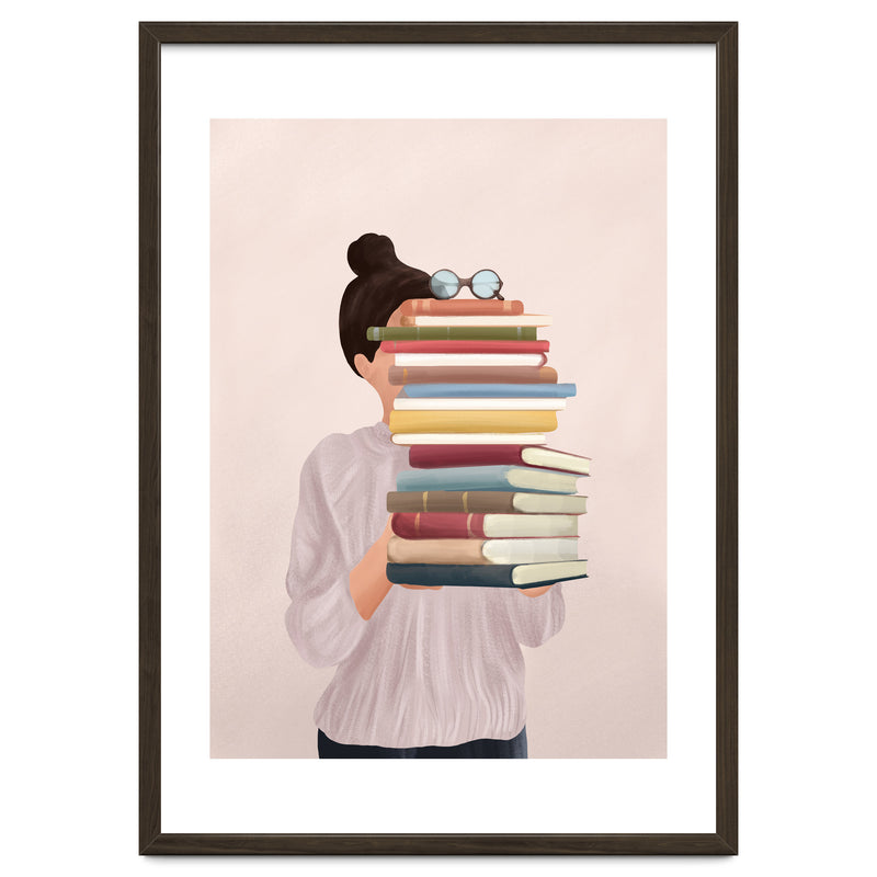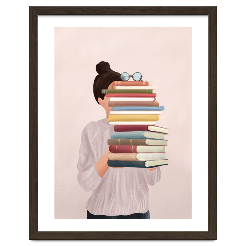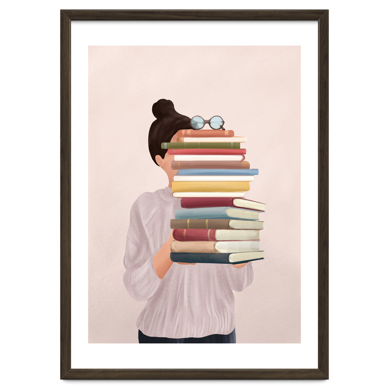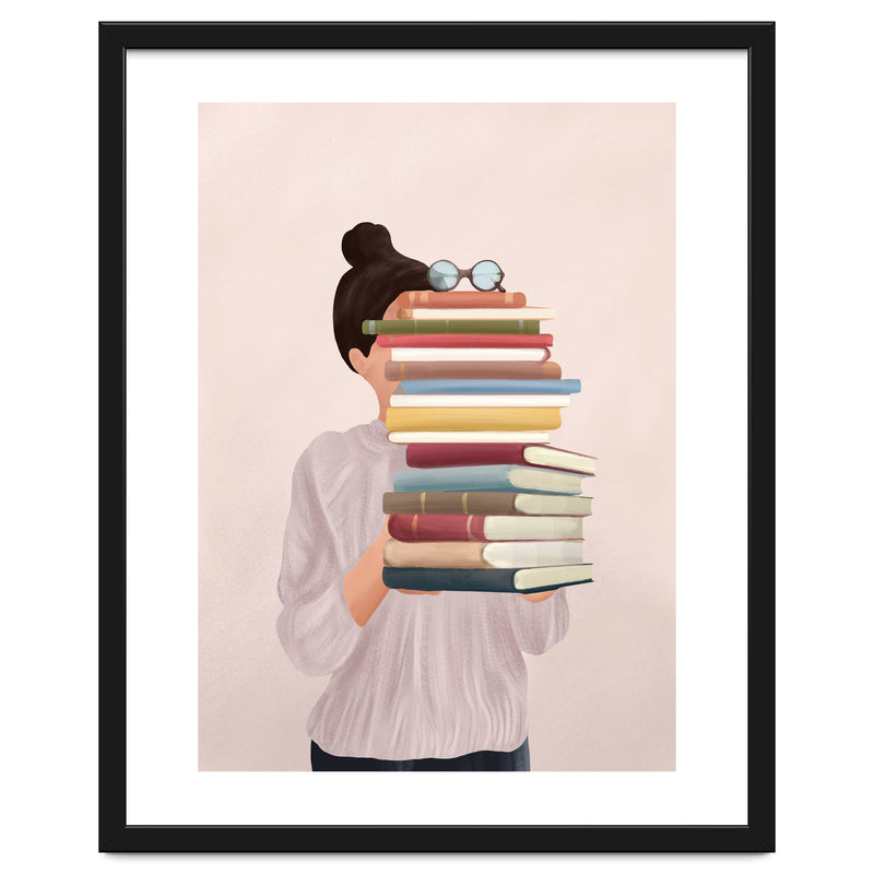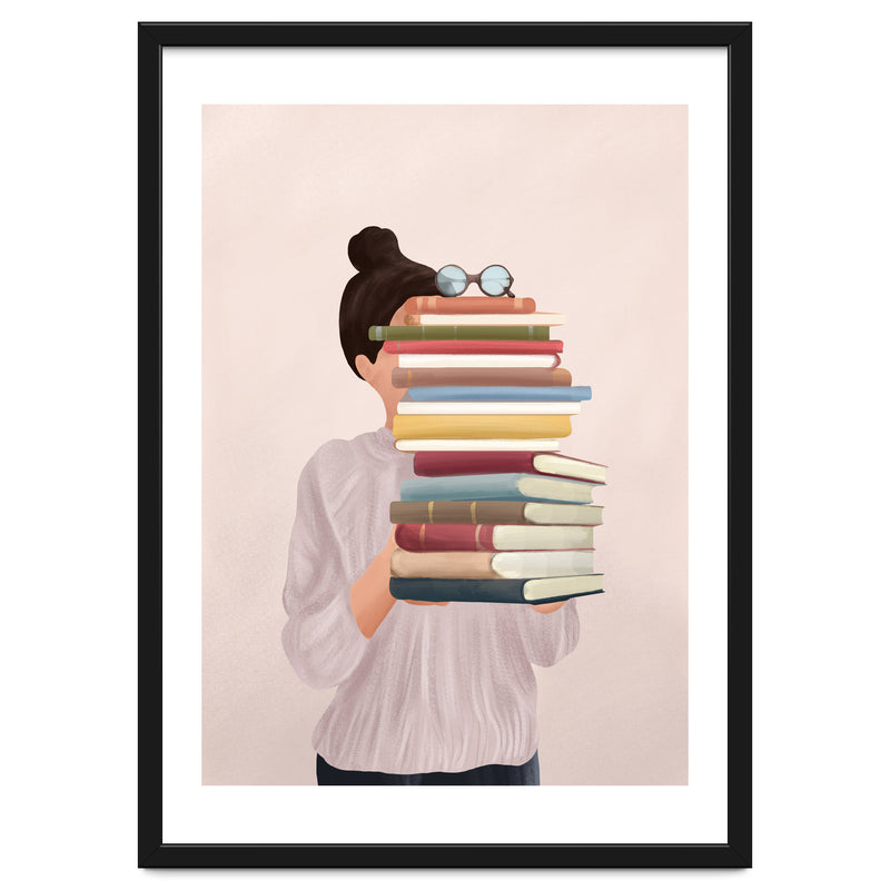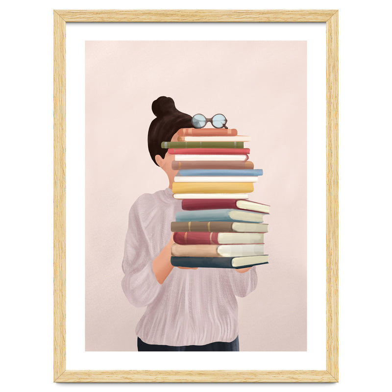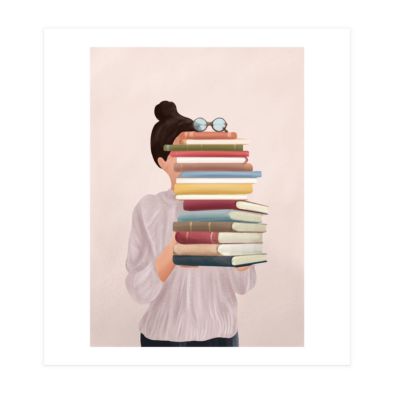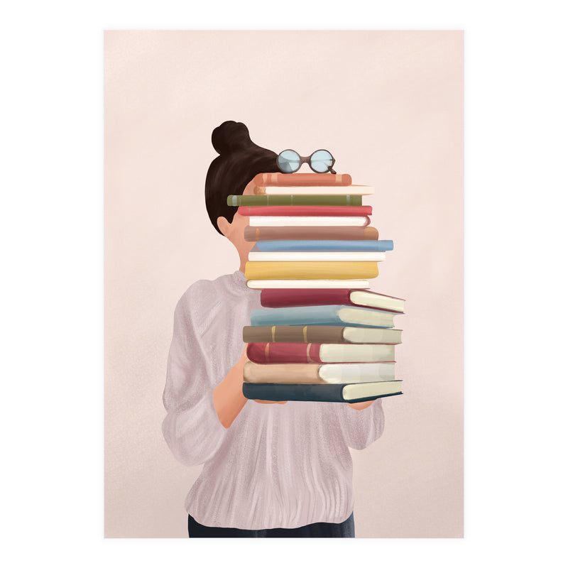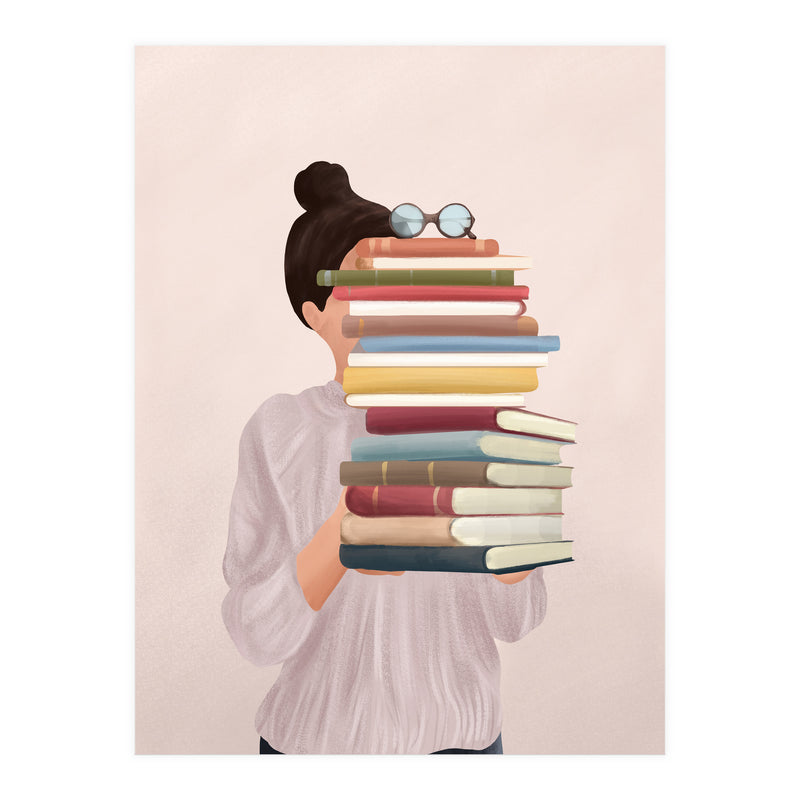 A soft, painterly illustration of a woman holding a stack of books that obscures her face, exploring themes of identity, learning, and the silent companionship of stories.