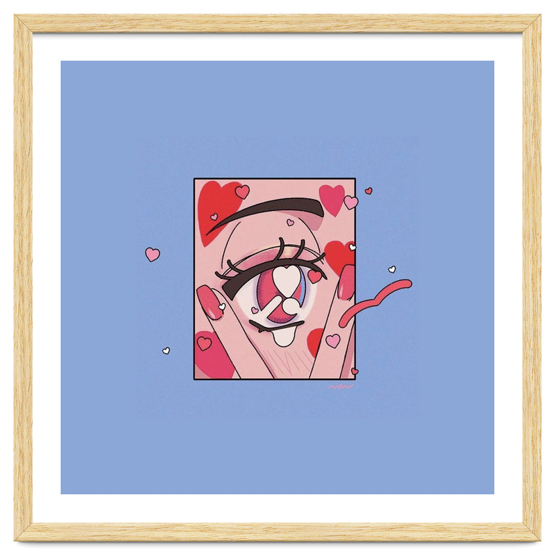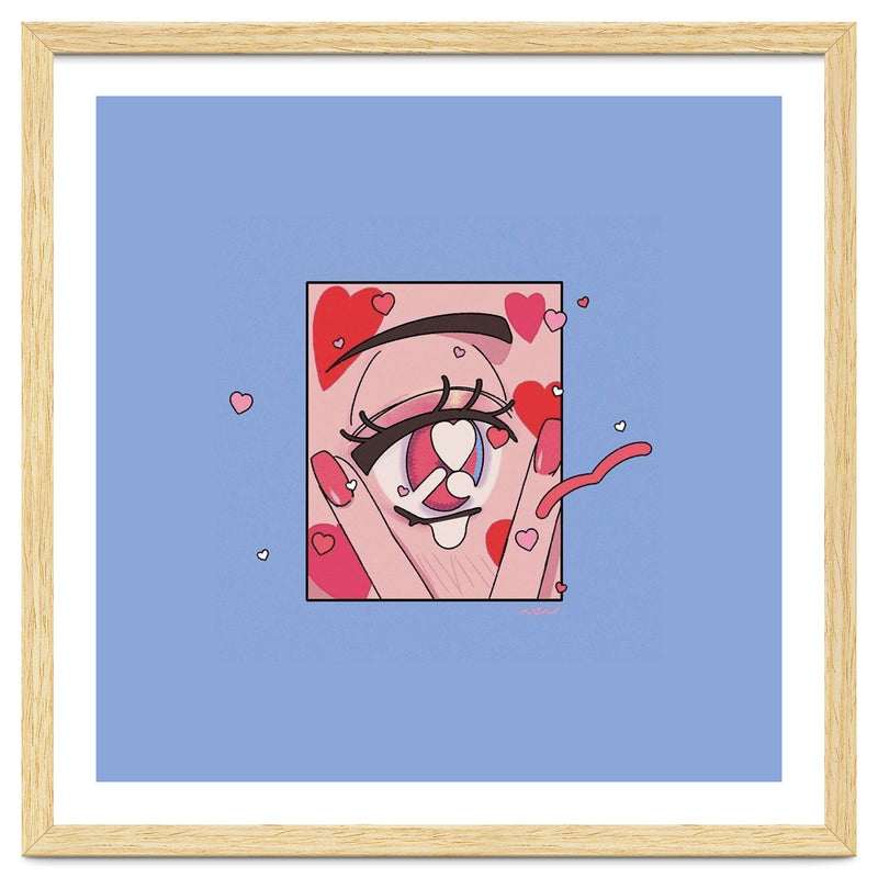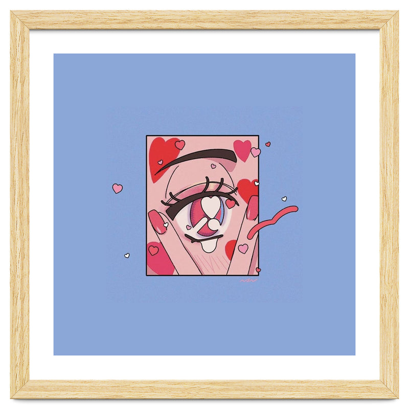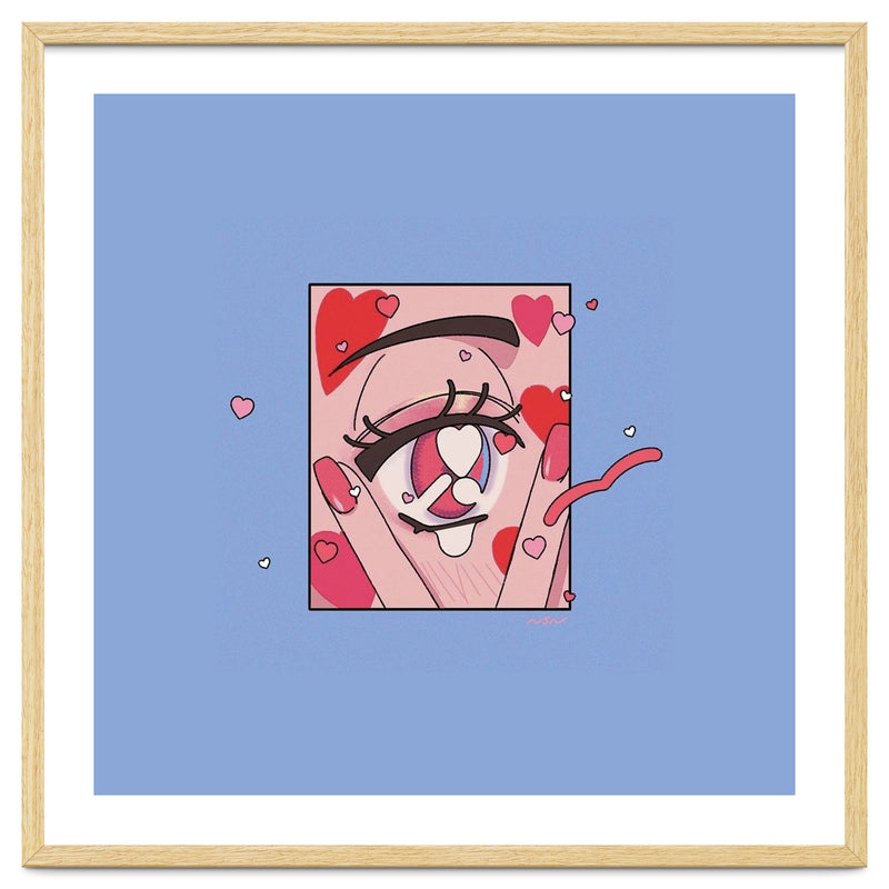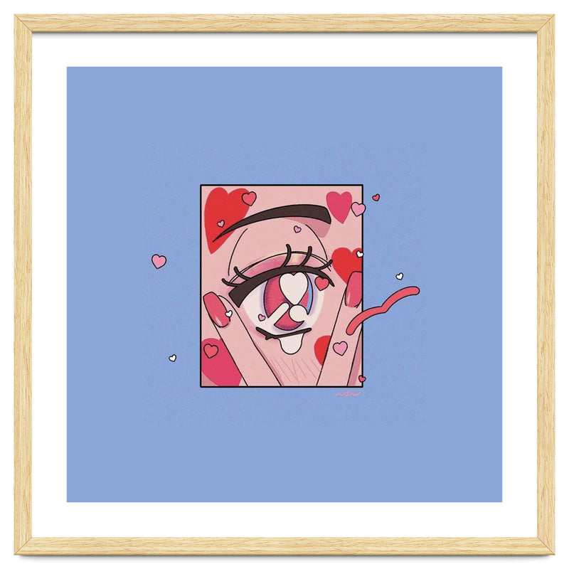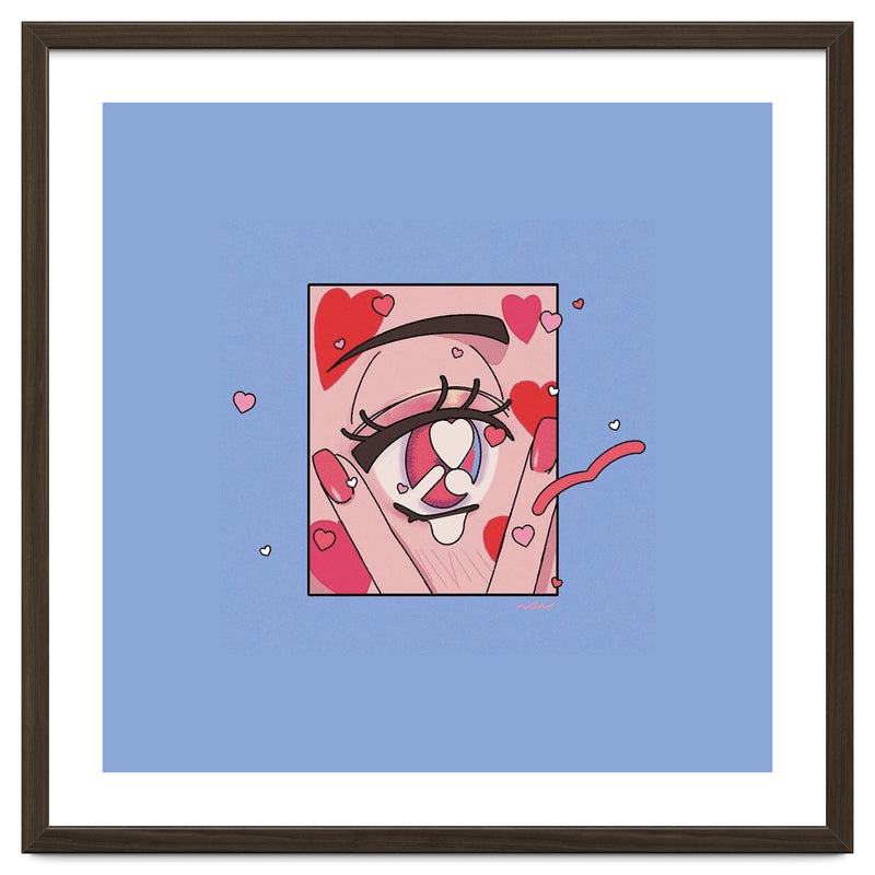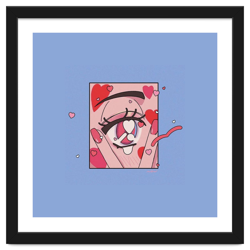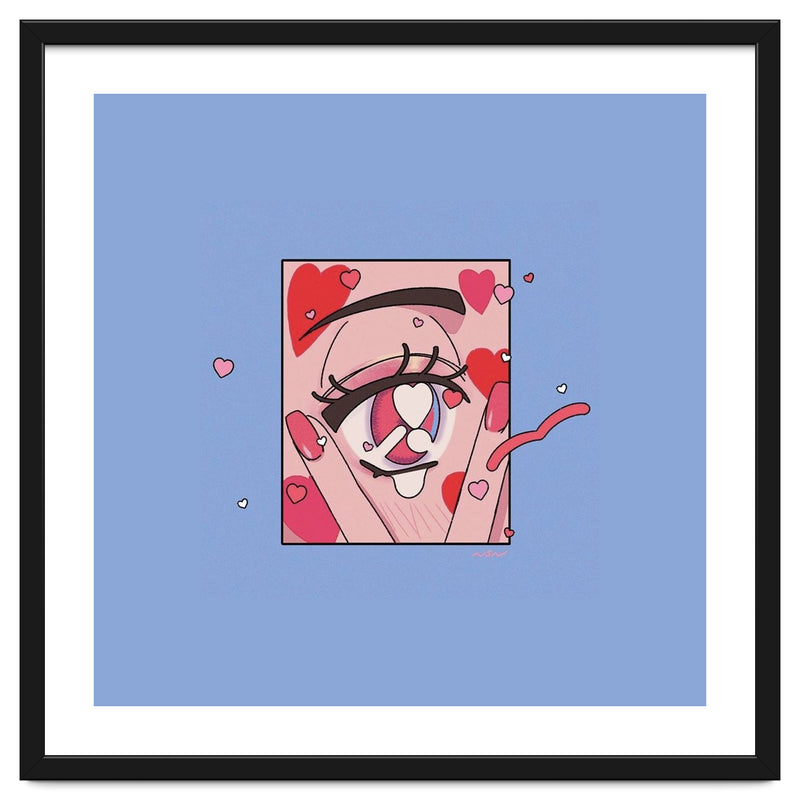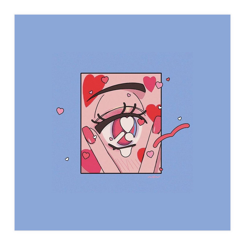 A playful and expressive digital illustration focusing on a cute eye surrounded by floating hearts. The soft pinks and reds create a whimsical, romantic atmosphere.