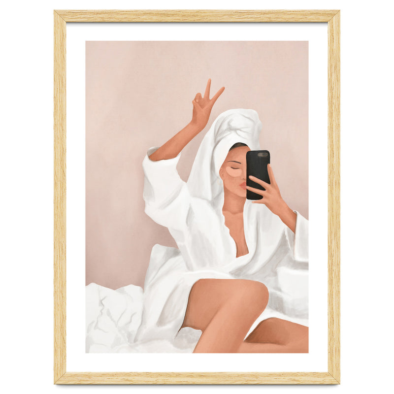 A soft, painterly illustration of a woman taking a morning selfie in a white robe, capturing themes of self-expression, ease, and contemporary stillness.