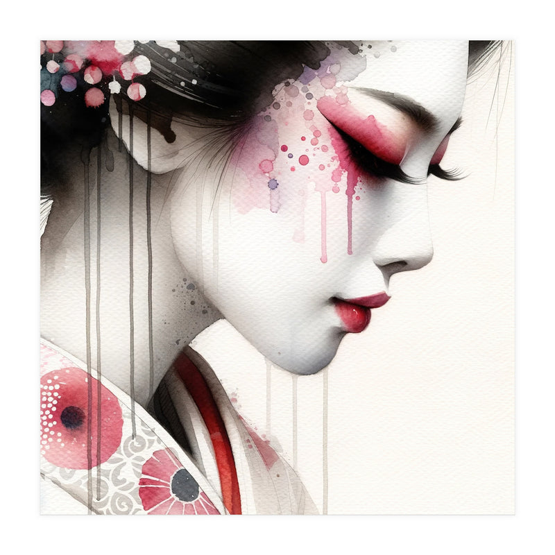 Close up watercolor portrait of a modern geisha in quiet side view. Soft rose washes shape eyelid and cheek while delicate droplets drift near the temple. A refined floral kimono pattern adds texture and the open background preserves clean negative space, keeping the silhouette crisp at large scale for elegant contemporary interiors.