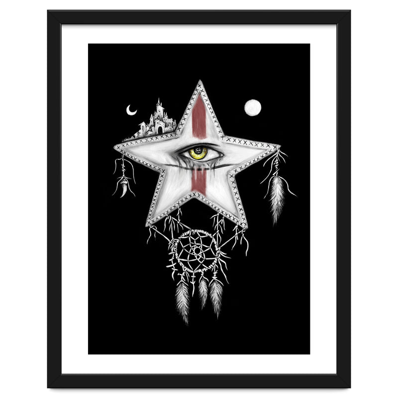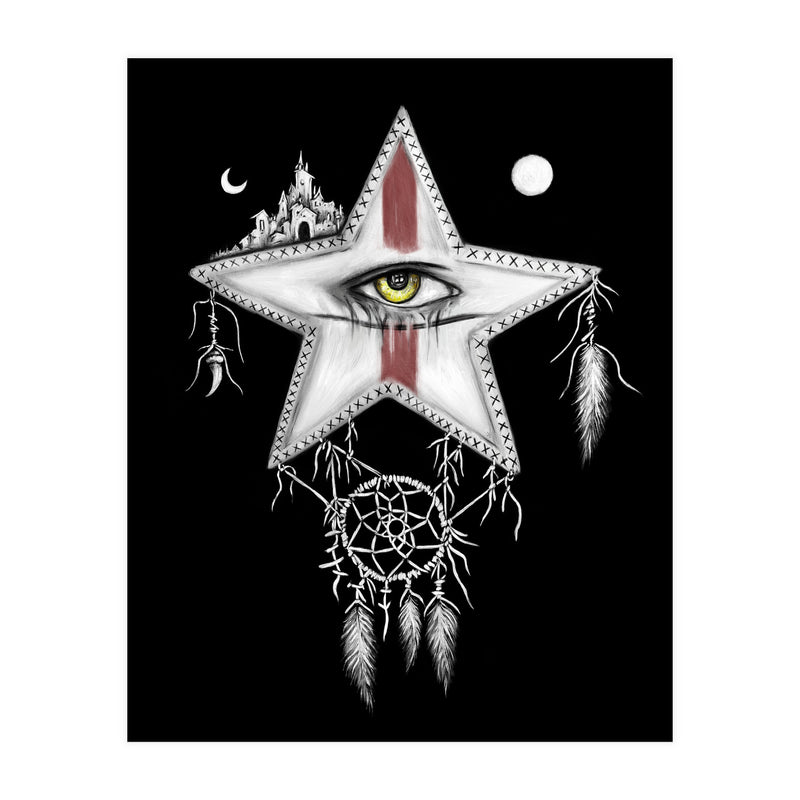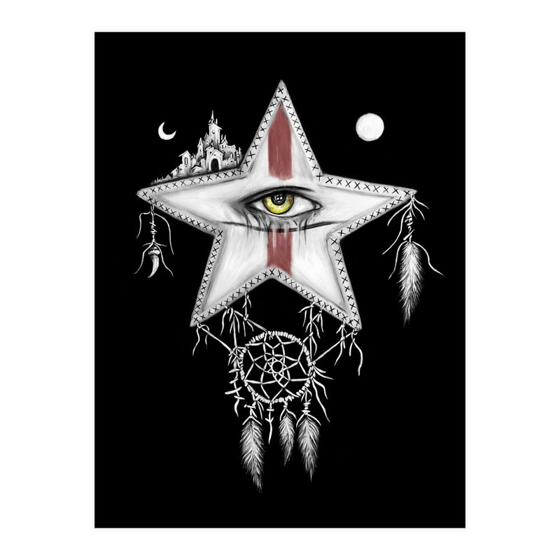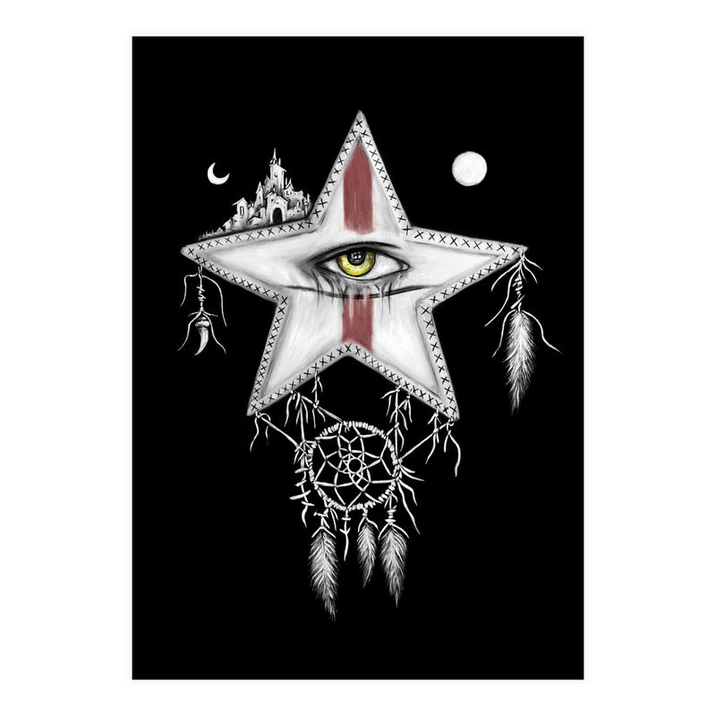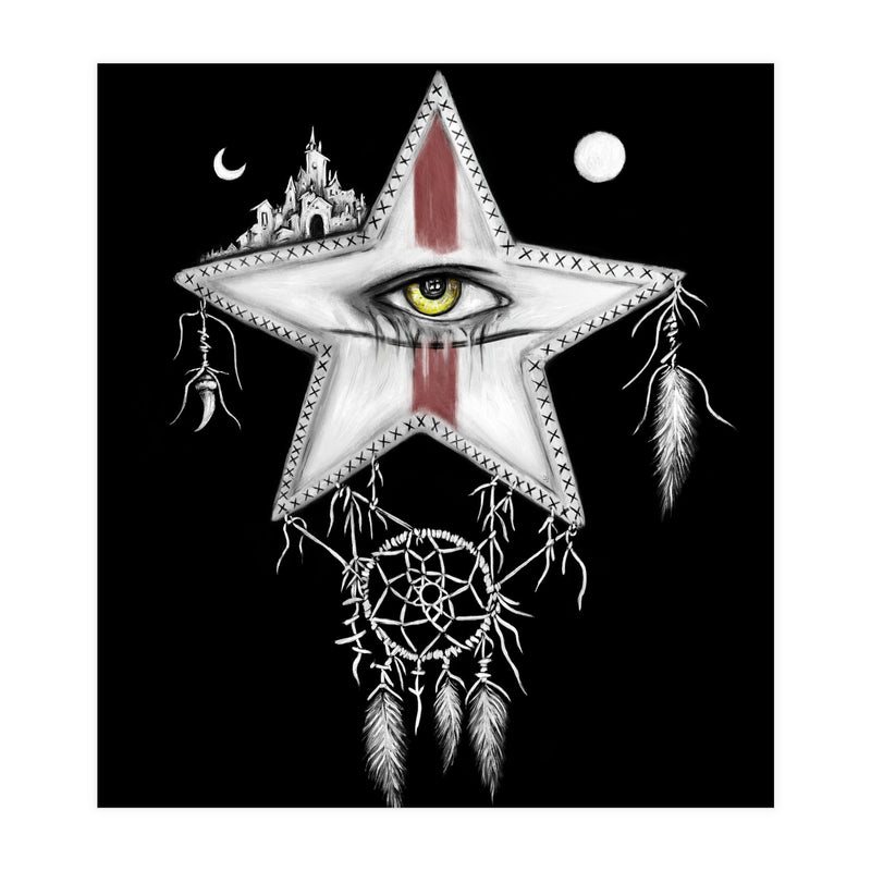 Surrealism themed black and white mixed media oil painting and digital painting of a star with a yellow vampire eye, and red war paint on it's face. Above it are a sun and moon, and a ancient city. Hanging below it is a dream catcher with pale feathers hanging from it.