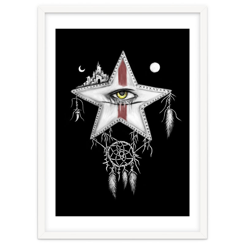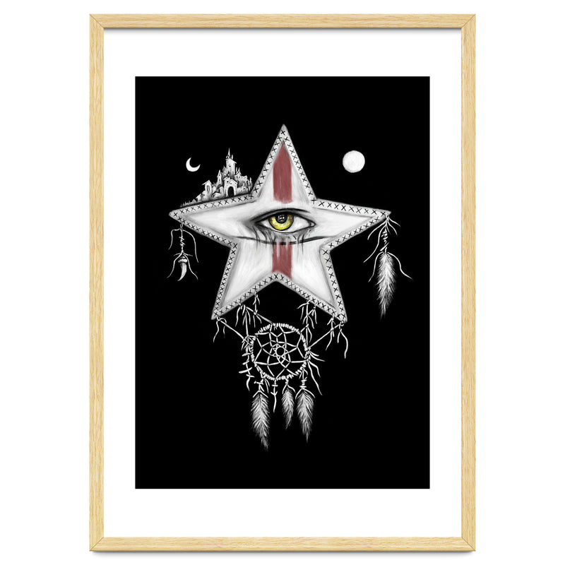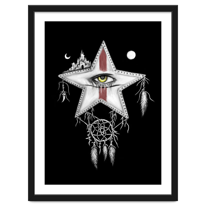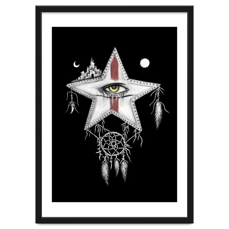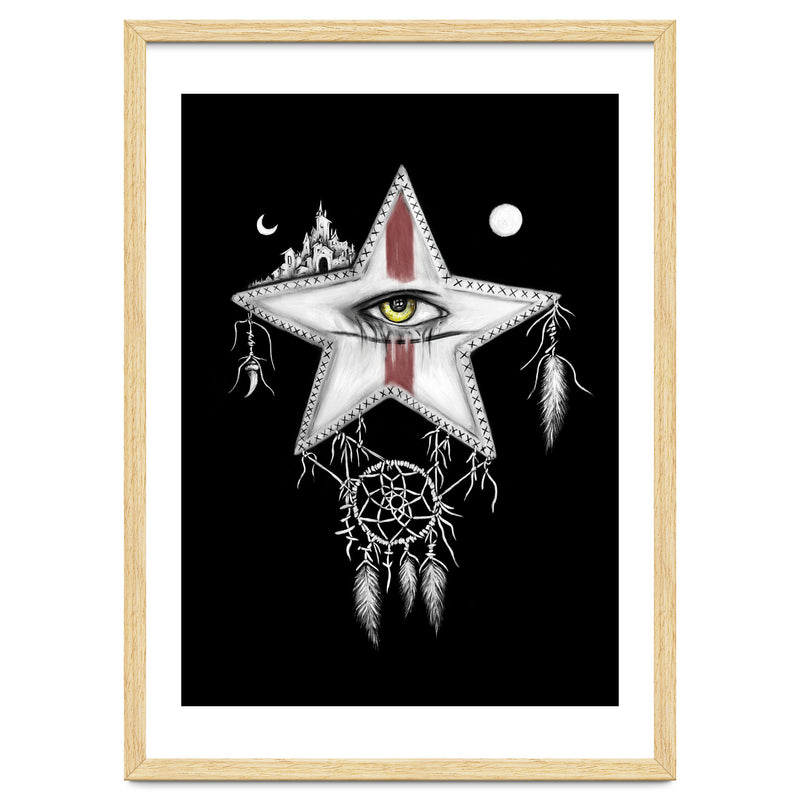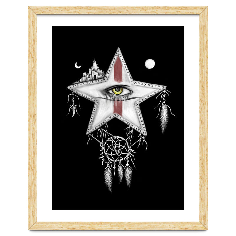 Surrealism themed black and white mixed media oil painting and digital painting of a star with a yellow vampire eye, and red war paint on it's face. Above it are a sun and moon, and a ancient city. Hanging below it is a dream catcher with pale feathers hanging from it.