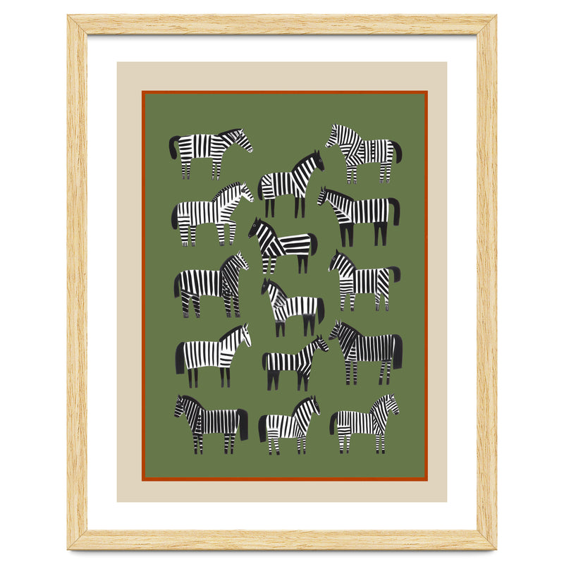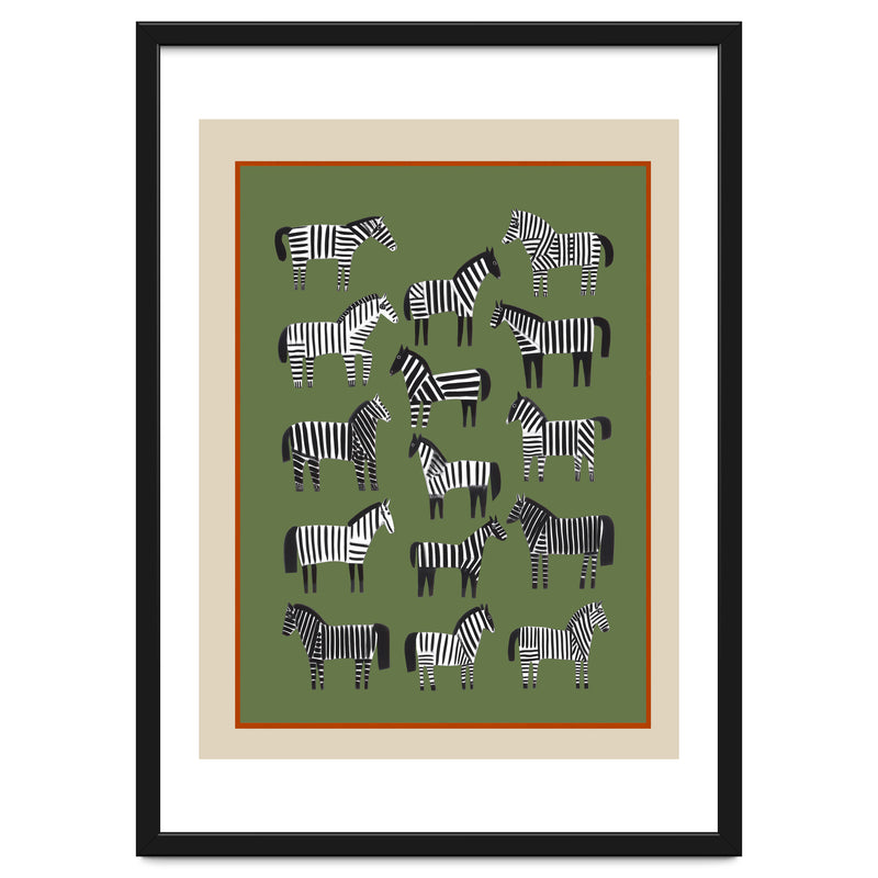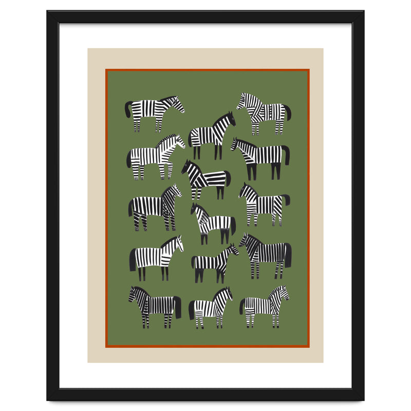 A bold modern wildlife composition featuring a collection of stylized striped horses arranged across a muted olive-green backdrop. The repeated silhouettes create a rhythmic pattern that feels both playful and thoughtfully balanced.